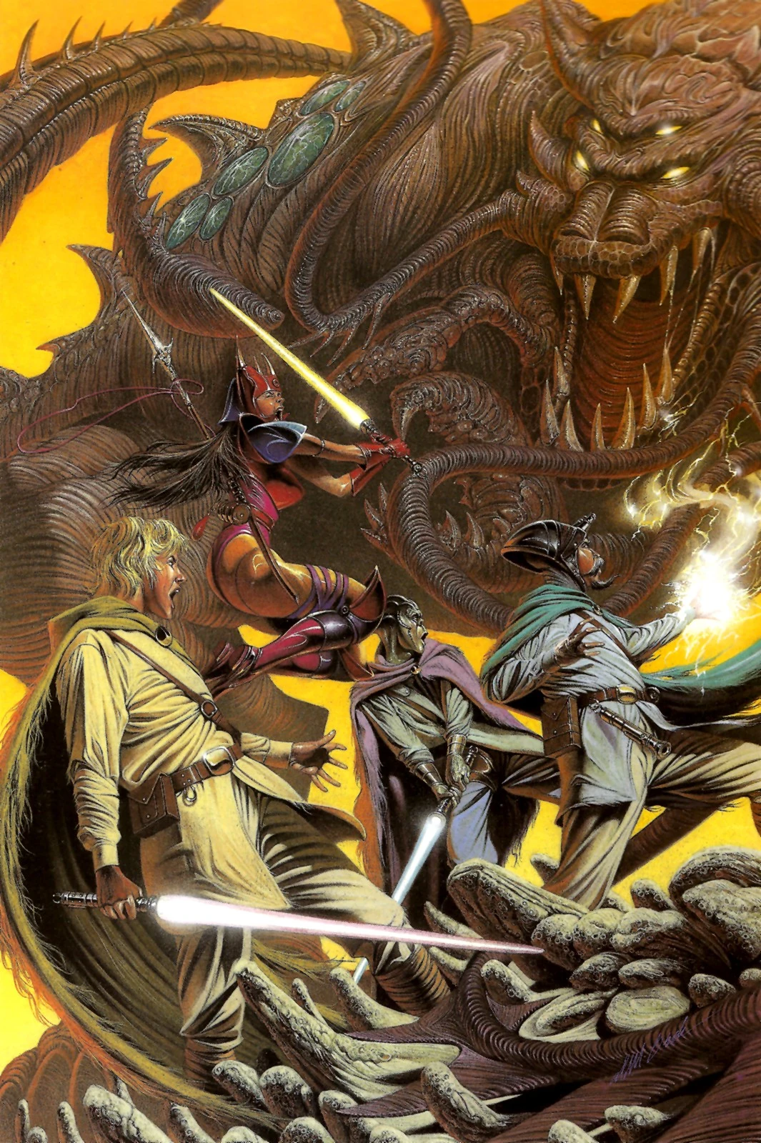 Достигнув места, где Дорск 82 оставил Дюррона, группа джедаев спустилась в шахту, где появилось существо. Здесь они обнаружили большое число личинок левиафана, животного, которое разорило колонию. Личинки напали на джедаев, но они отразили нападение, используя Силу и световые мечи. Джедаи продолжили искать Дюррона, ощущая его присутствие в другом конце шахты и, выйдя наружу, нашли Дюррона возле левиафана, убитого в сражении. Однако вскоре выяснилось, что левиафан, которого победил Кип, был только детёнышем, а на джедаев напало взрослое животное, в брюхе которого находились ещё живые души колонистов. Джедаи попытались отпугнуть или поймать животное, но им это не получилось, и им пришлось воспользоваться световыми мечами. Левиафан упал в шахту, но не погиб даже в озере магмы. При этом Кирана Ти сама чуть не свалилась в лаву, но её поймал за руку Кип. И лишь Дорск 82 придумал, как победить его, используя размещённый в шахте генератор. Пока Кирана Ти и другие джедаи отвлекали существо, Дорск 82 запустил генератор, и когда левиафан коснулся металлических кабелей, подключенных к нему, то погиб от удара током. Джедаи с победой вернулись на Явин-4. Их великую победу на Корбосе помнили даже много лет спустя.
