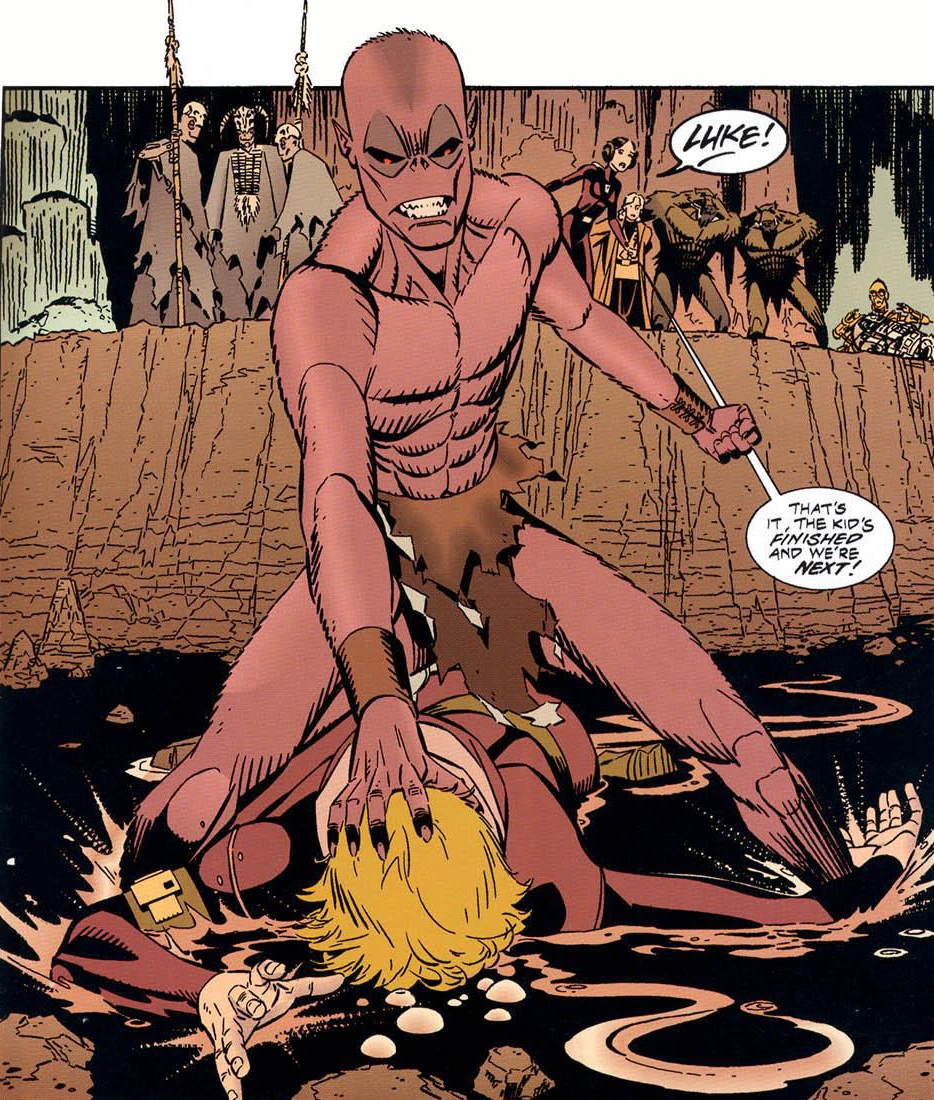 Хатт Бвал захотел заполучить какие-то древние артефакты, чтобы потом продать, и вот за ними-то нам пришлось тащиться на эту трясинную планетишку, расположенную на задворках галактики. Ну вот, а там мы встретились с таким здоровенным громилой по имени Джейк — уродом в грязной шахтёрской спецовке.