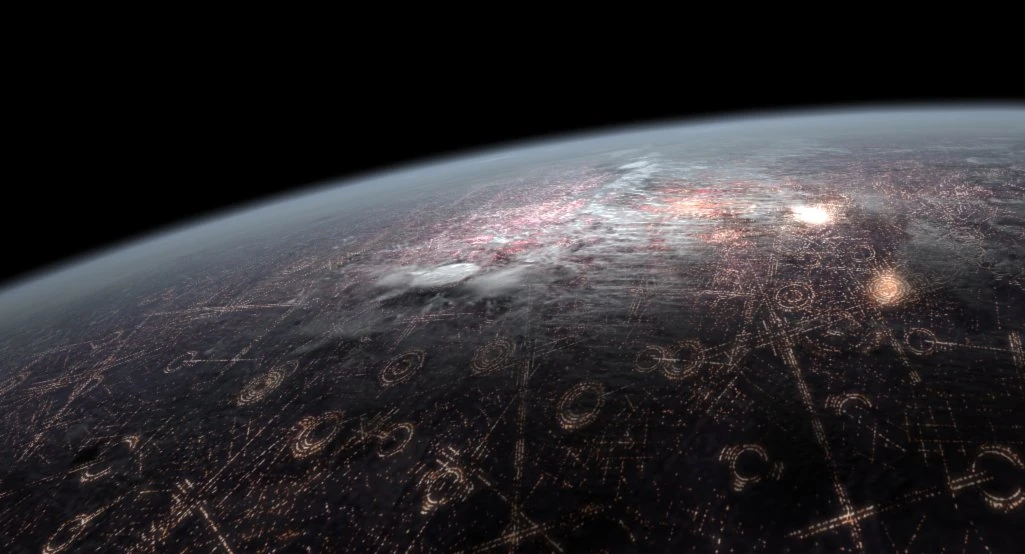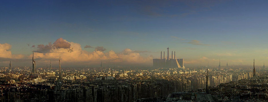 Если смотреть поверх облаков, Корусант казался спокойным и тихим, виднелись лишь верхушки самых высоких зданий, взмывающих в атмосферу на высоту до 6 километров. Но под облаками на самом деле скрывалась галактическая столица — густонаселённый многоуровневый мегаполис, напоминающий гравированный металлический шар.