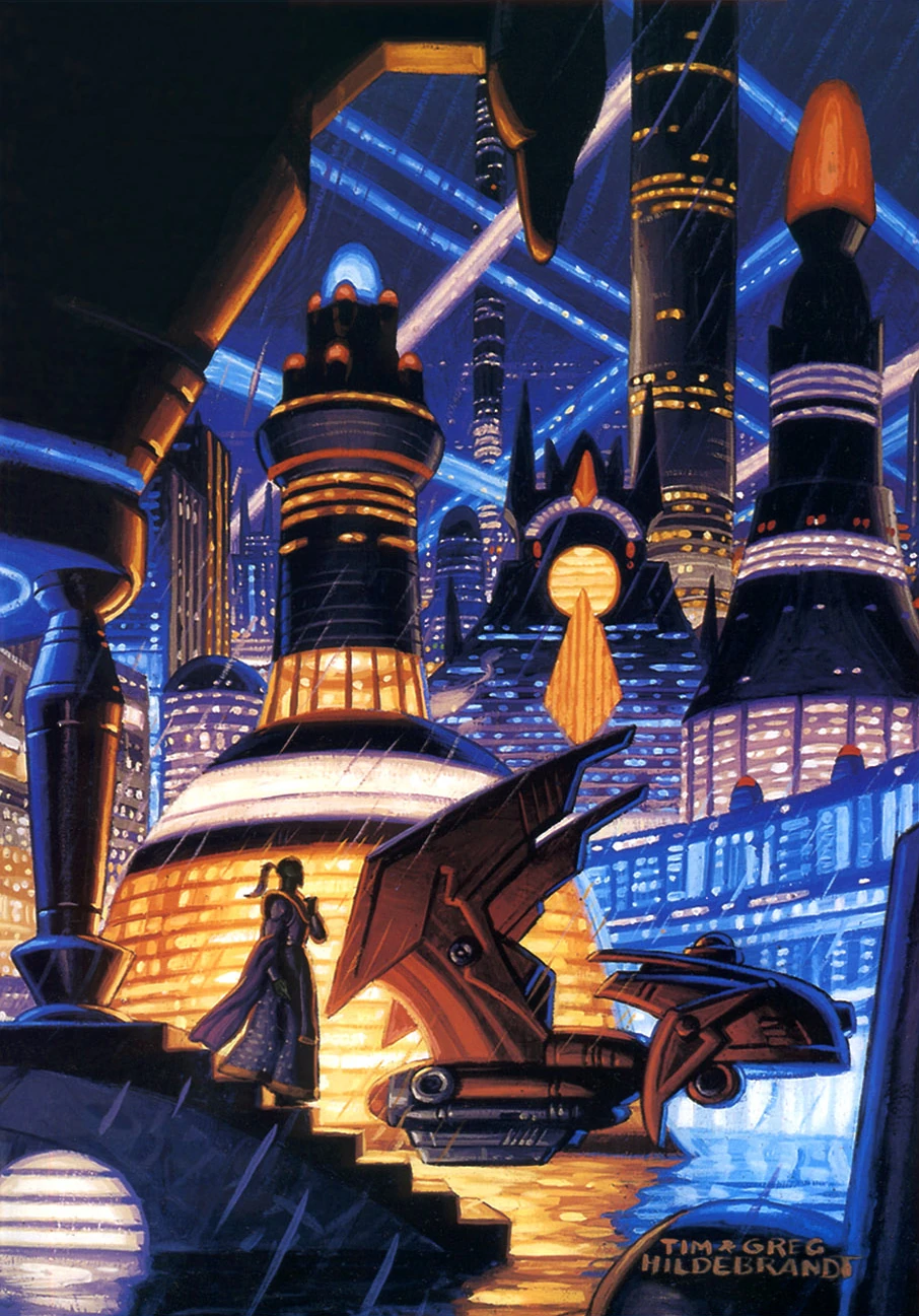 Громадные кварталы увеселительных заведений галактической столицы привлекали несметное число чужеземцев, которые стремились в ночные клубы, игорные дома, бары и дворцы наслаждений. Эти районы иногда залиты светом и полны нарядной публики, а иногда внезапно погружались во тьму и тишину, замирая в страхе. На таких улицах за каждым углом таилась опасность, а праздного гуляку было не отличить от вора, убийцы или торговца наркотическими пряностями.