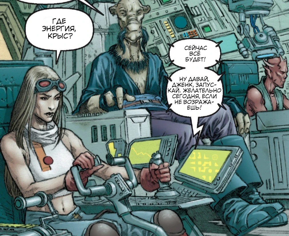 Крис Таанзер, капитан Шурк-Херен и навигатор Фырк в кабине «Ухумеля».