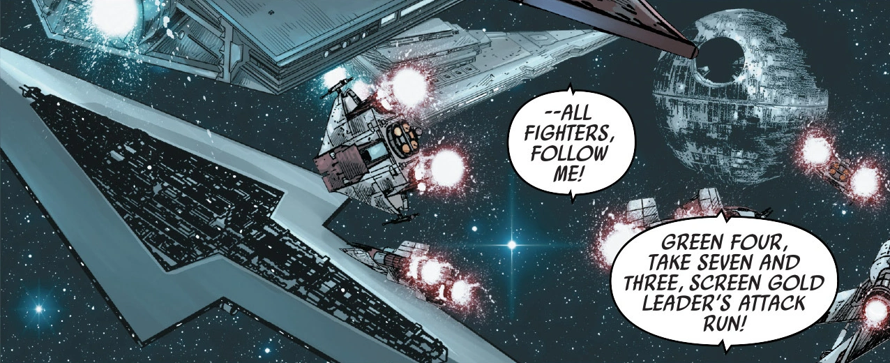 Л'уло Л'эмпар и пилоты зелёной эскадрильи атакуют «Палач» во время битвы при Эндоре