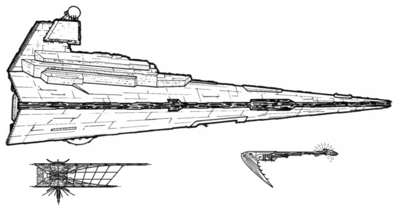 Сравнительный чертеж крейсера типа «Новая звезда», хейпанского боевого дракона (500 м в длину) и звёздного разрушителя типа «Имперский I» (1600 м в длину)