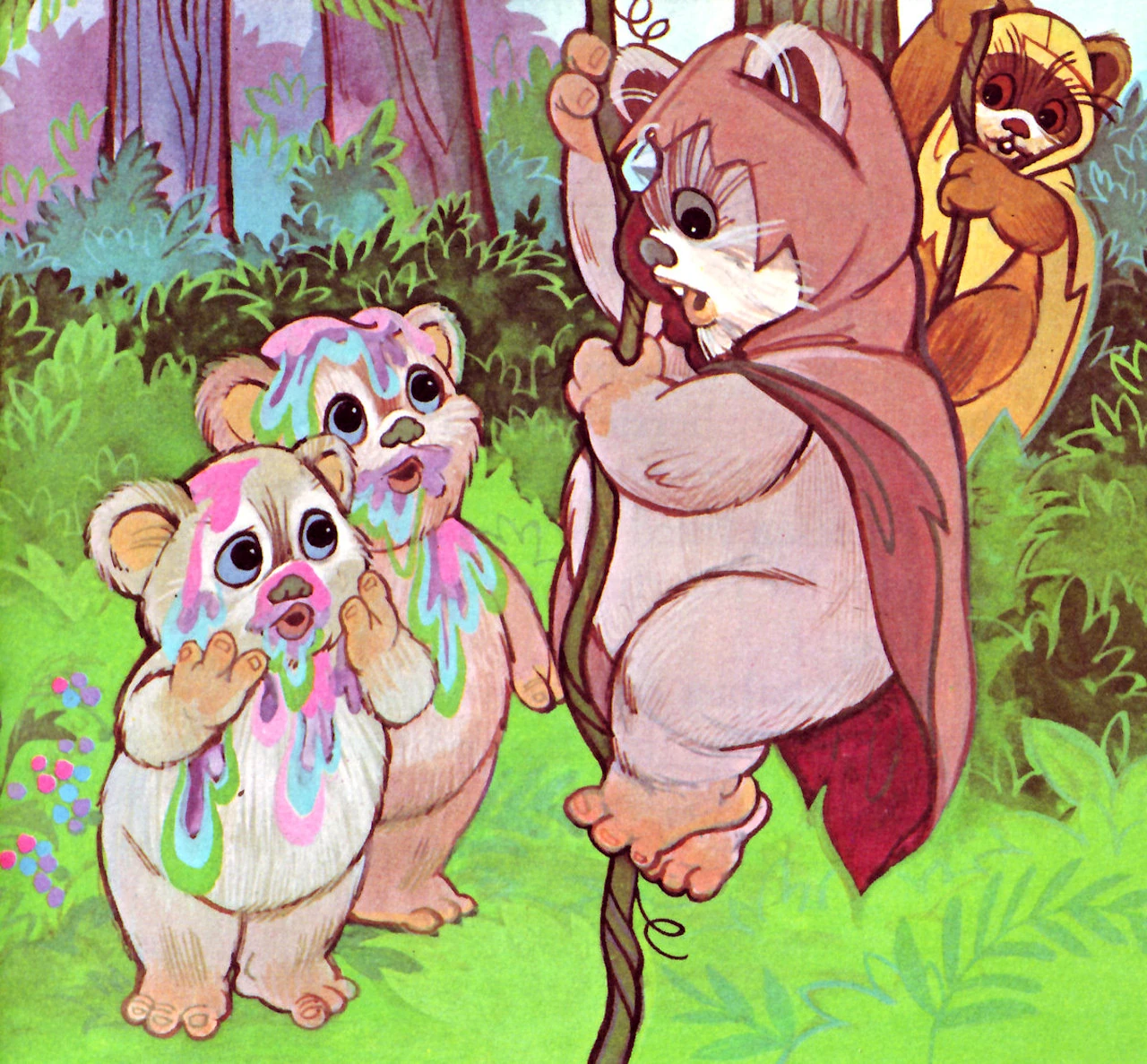 Когда вся компания приходит на реку, малыши своими проказами доставляют немало беспокойств: сперва они отпускают всю рыбу, которую поймал Уикет, затем перемазываются мёдом и привлекают роль злых пчёл, а затем, пока Нисаа и Уикет влезают на дерево, перемазываются ягодным соком. Вернувшиеся старшие отчитывают Ниппета и Уайли, но затем узнают, что они нашли радужные ягоды, которые так любят эвоки.