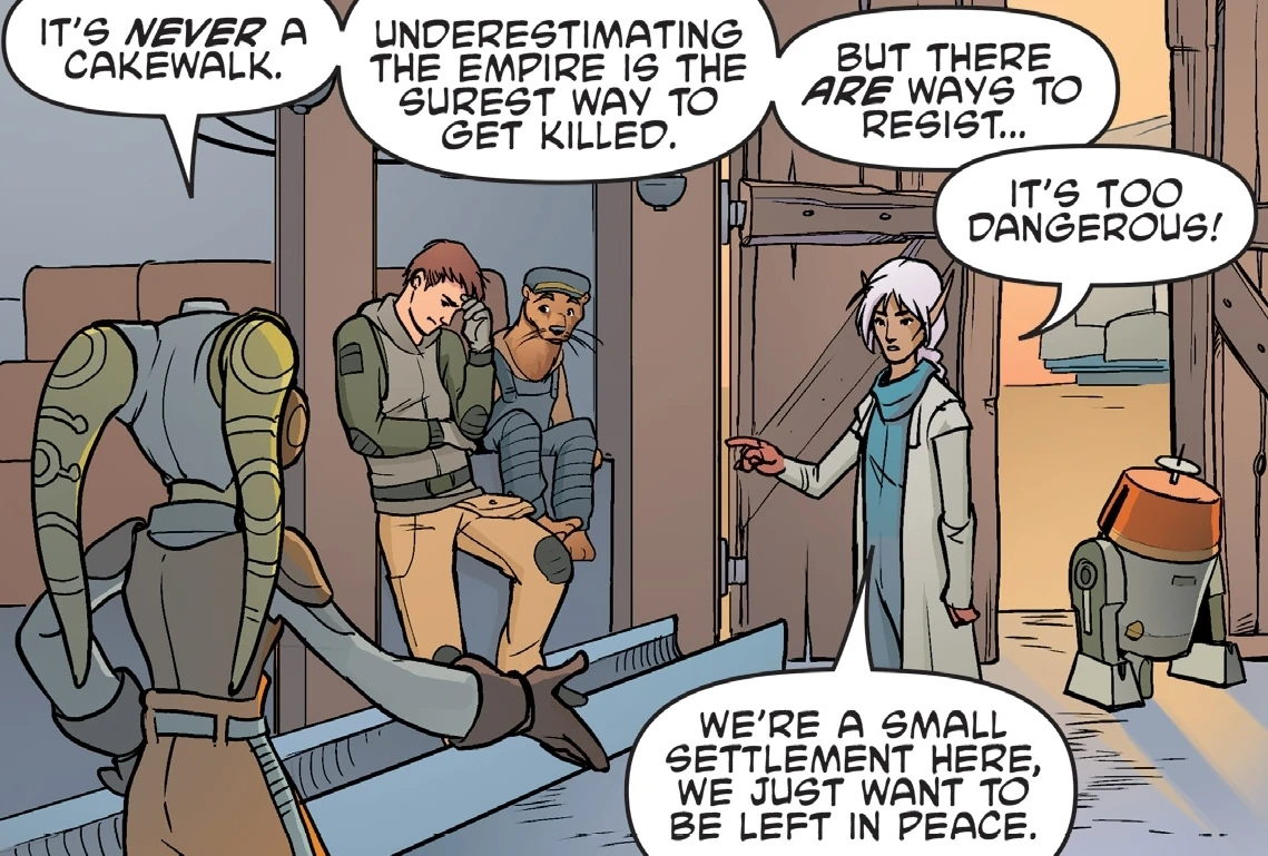 Вскоре тви’лека и Бёрл собрали заговорщиков — О Бри и механика Лемноса, — и обсудили методы борьбы. По совету девушки жители аванпоста начали всячески открыто саботировать производство, прикрываясь авариями механизмов и природными напастями. В конце концов, коммандер Жоу, для которого провал миссии означал бы падение в глазах отца, через неделю задержек и провалов лично выступил перед жителями, пригрозив суровыми наказаниями за дальнейшее саботирование работы.[2]