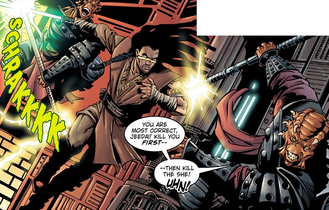 - «Воины-моргукаи никто — одни из самых смертоносных существ в галактике. Они обучены убивать чувствительных к Силе, а уж одолеть нечувствительного для них так же просто, как сделать вдох».