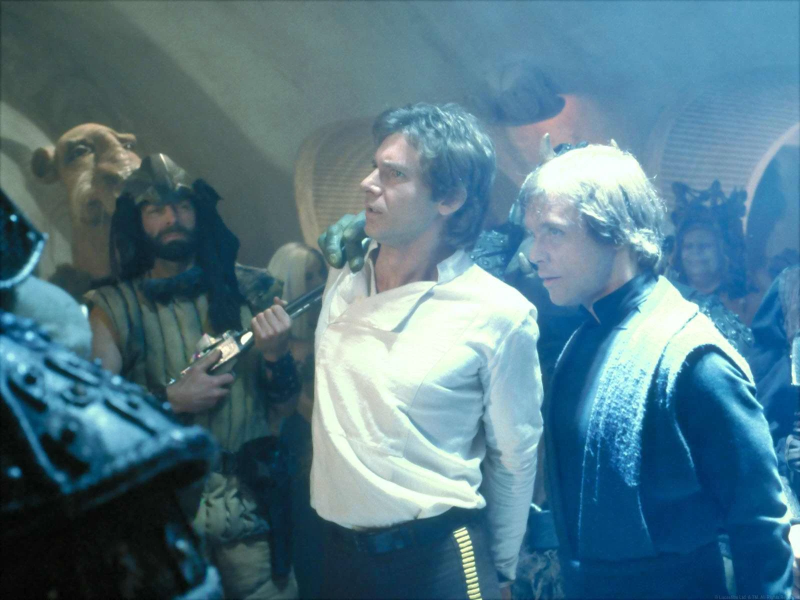 В книгах «Возвращение джедая: Постановка National Public Radio» (сценарии радиопостановки «Возвращение джедая») и Choose Your Own Star Wars Adventure: Return of the Jedi Люк Скайуокер вырывает бластер не из кобуры Найзука Бека, а из руки гаморреанского стражника.