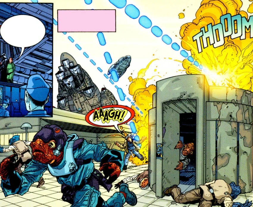 Благодаря массированной бомбардировке тёмные солдаты легко пробились сквозь дефлекторные щиты базы «Тек»: нападение было столь молниеносным и внезапным, что у повстанческого гарнизона, мон-каламари и людей, не было шанса защитить себя, не говоря уже о том, чтобы нанести ответный удар. Командир базы адмирал Тока, видя невозможность эвакуации персонала, отдал приказ капитану Боку, командиру звёздного крейсера «Унылая красотка», немедленно покинуть планету, чтобы предупредить о произошедшем нападении союзников. Второй из находившихся на базе крейсеров Мон-Каламари, по-видимому, был выведен из строя ещё до того, как смог взлететь[4].