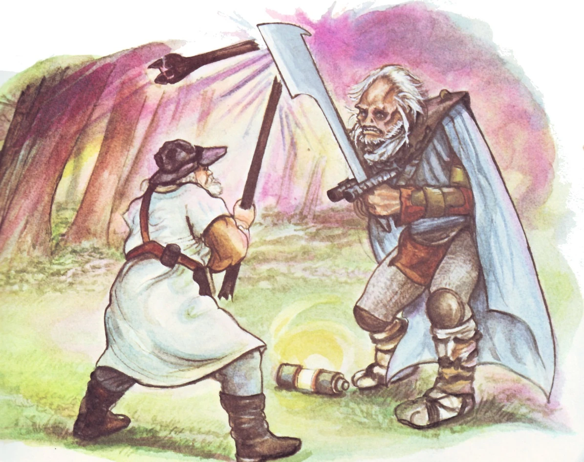 Ноа прибыл на свой корабль, когда атака саньяссанцев уже началась. Бриквалон смог восстановить подачу энергии в корабль, но несколько попыток поднять крейсер в воздух оказались неудачными. Тогда Ноа перенаправил энергию в счетверённые лазерные пушки, и посадил нескольких эвоков управлять орудиями. Пушки корабля смогли переломить ход сражения, оттеснив мародеров.Однако, предводитель саньяссанцев Терак взял в заложницы Синдел и потребовал от Ноа осцилятор. Что бы спасти жизнь девочки, Бриквалон вступил в заранее безнадежную дуэль с предводителем мародеров, используя свой походный посох против меча Терака. Спас Бриквалона от гибели Уикет Уоррик, который выстрелил в Терака из рогатки и случайно активировал артефакт датомирской ведьмы Чарал, Камень ворона, который Терак носил на шее. Энергия камня спалила саньяссанца дотла и битва была выиграна.