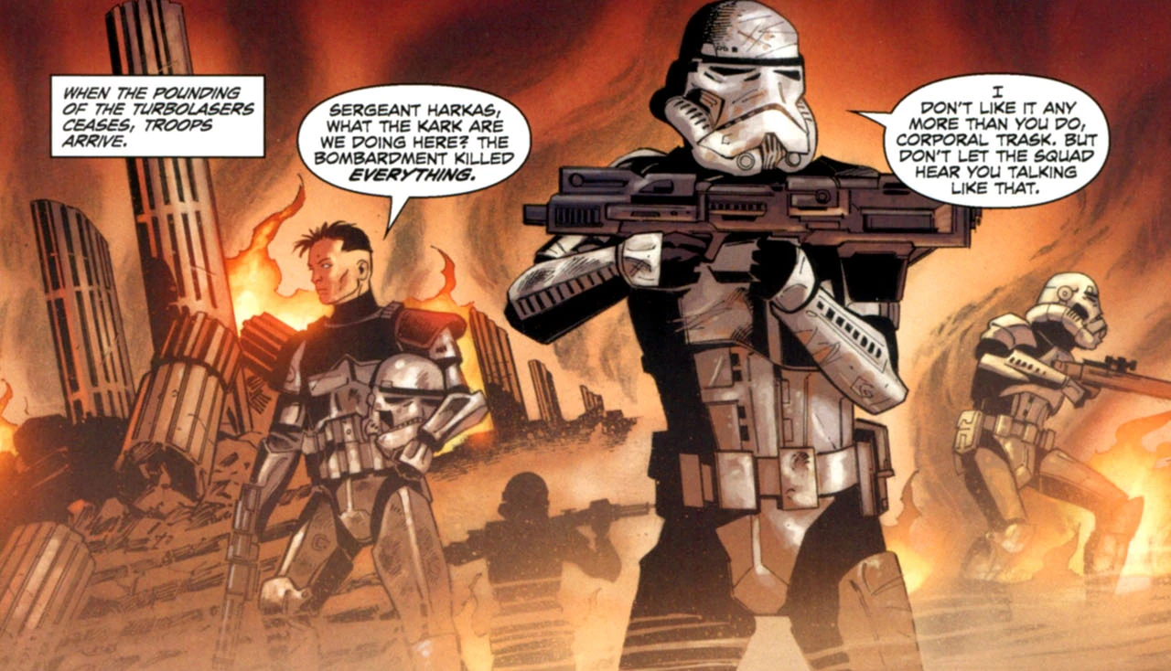 На земле штурмовики во главе с сержантом Харкасом добили выживших. Один из его подчинённых, капрал Траск, выразил неодобрение действиям ситхов, идущим вразрез с законами и обычаями войны. Тем не менее Харкас рассудил, что они только выполняют приказ, и в поддержку своей правоты добил раненого[2].