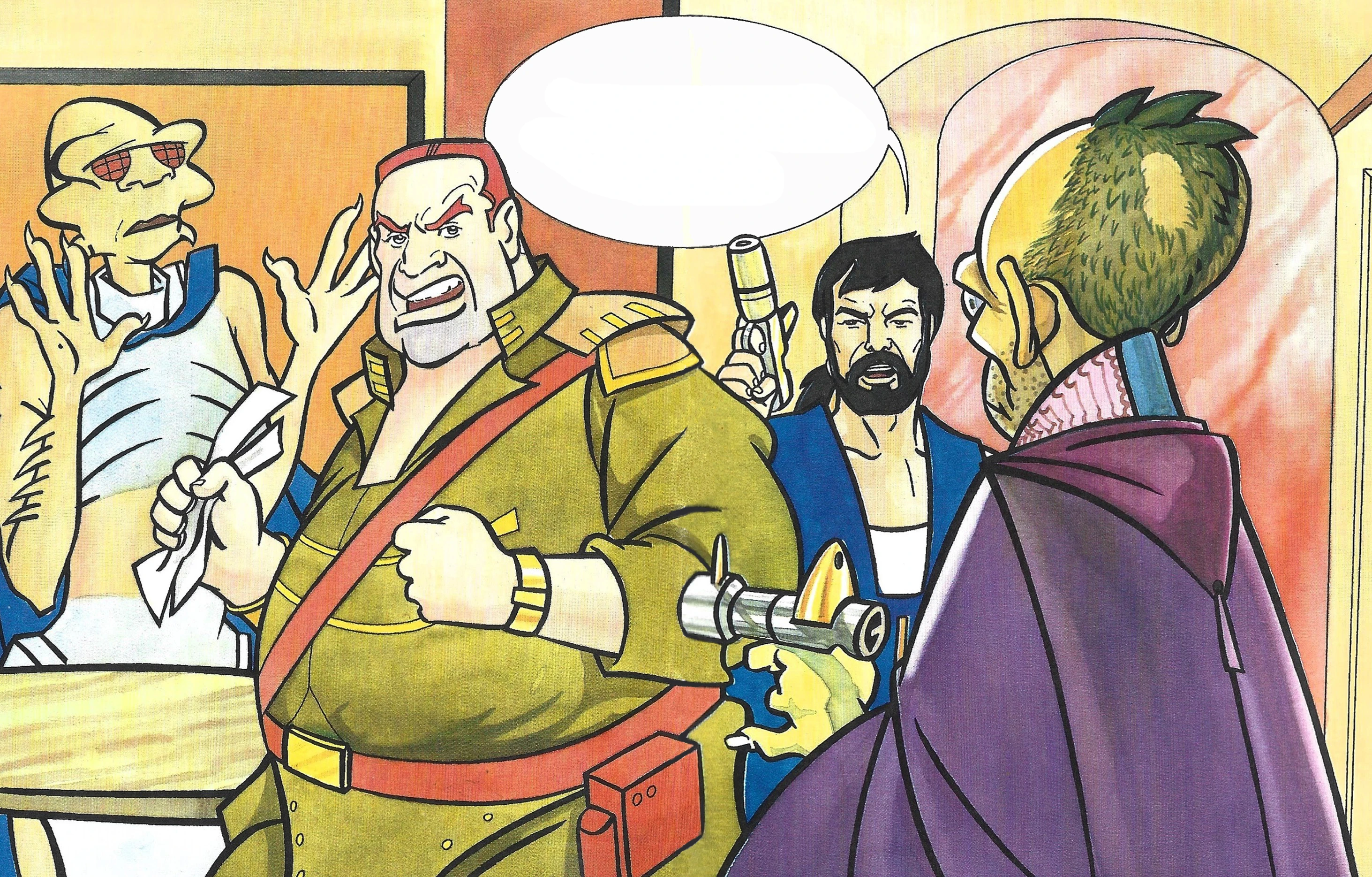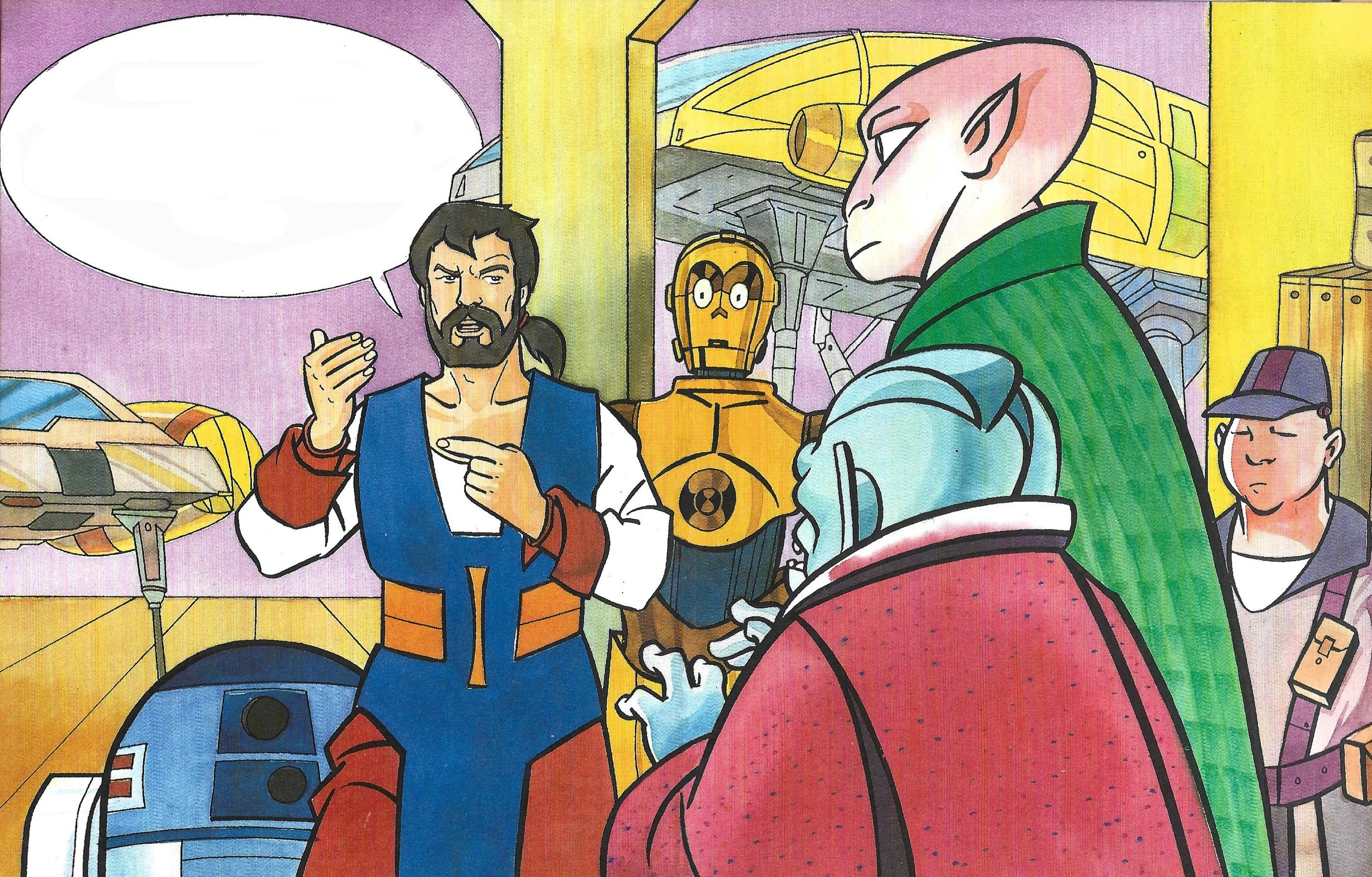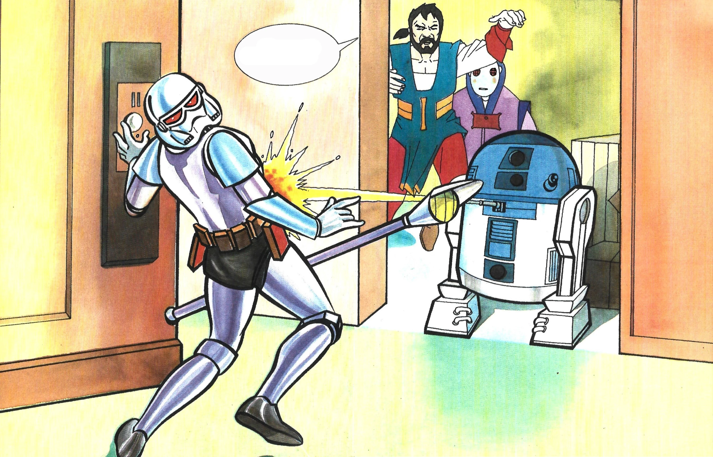 Манго Баобаб договаривается с другими пленниками о нападении на дроида-охранника, однако на следующие развороте R2-D2 стреляет в кого-то в броне штурмовика. Неизвестно, был ли это живой штурмовик или дроид-охранник, получивший соответствующий облик.