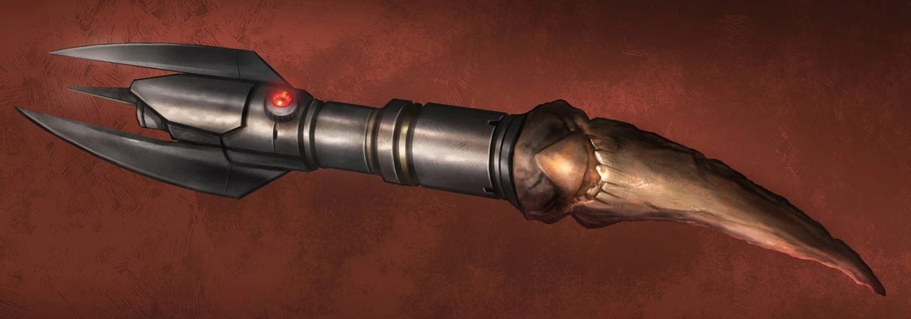 Этот световой меч принадлежал владыке-ситху Дарту Барасу из Возрождённой империи ситхов времён её галактической войны со Старой Республикой. Рукоять светового меча, слегка искривлённая, состояла из двух частей, нижняя из которых представляла собой клык ранкора, а верхняя была увенчана тремя заострёнными шипами, у основания красного клинка.