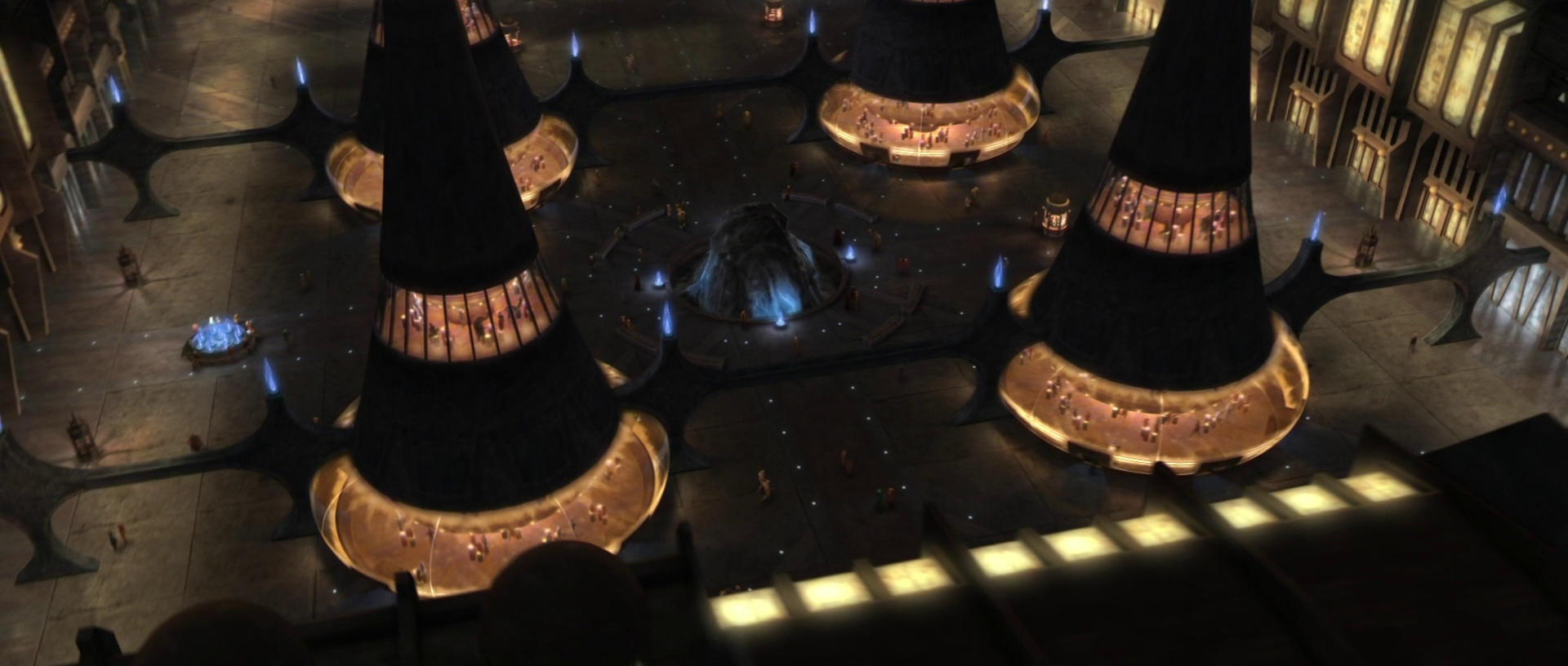 Во время Войн клонов, всегалактического конфликта между Галактической Республикой и Конфедерацией независимых систем, герцогиня Сатин Крайз и мастер-джедай Оби-Ван Кеноби тайно встретились на площади, когда она скрывалась от сил безопасности Корусанта, разыскивавших её по подозрению в убийстве.[2] Она передала Кеноби запись, которая очищала её имя. Позже во время войны на площади двумя охотниками за головами был атакован сенатор Онаконда Фарр от Родии из-за его поддержки предложения о закупке дополнительных пяти миллионов клонов для Великой армии Республики. Речь сенатора Падме Амидалы позже транслировалась на экраны на площади.[5]