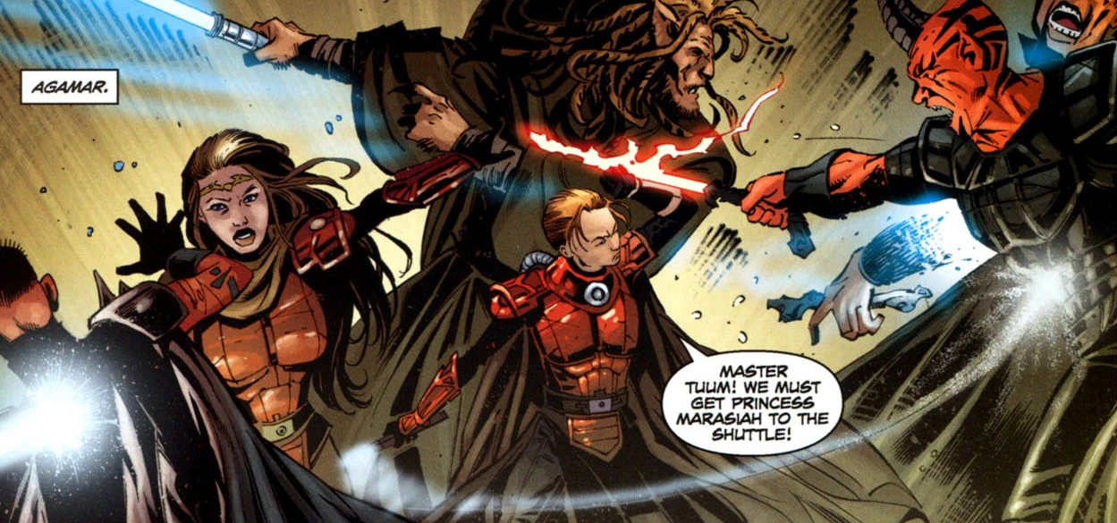 Через три дня после нападения на Агамар Туум и Рей устроили засаду на ситхов Юлна и Бокара, которые разыскивали выживших после битвы, и убили их. Они отыскали их корабль и уже собирались покинуть планету, но Эзлин была огорчена тем, что, не сумев защитить принцессу, она не выполнила свой долг. Катар попытался убедить её принять волю Силы, но она запальчиво возразила, что, по её мнению, воля Силы состоит в том, чтобы найти и спасти Марасию. Туум поначалу возражал, предлагая сперва лететь на Бастион, но в конце концов согласился попытаться[10]. Им удалось смешаться с флотом и приблизиться к его флагману, звёздному разрушителю «Молот войны». Однако проникнуть на борт им не удалось: посадочные коды корабля изменились, и их раскрыли. Им едва удалось бежать и отправиться на Бастион, чтобы оповестить Фела и Имперских рыцарей о том, что Марасия доставлена на Корусант. По прибытии они передали опознавательные коды сил Фела, что позволило им обойти минные заграждения на орбите планеты. Они совершили посадку на площадке, где их ждали Имперские рыцари Антарес Драко и Ганнер Криг, мастер-оружейник Хограм Чалк и джедай Шейдо Вао. После высадки Драко грубо отругал Рей за то, что она не смогла защитить принцессу. Туум попытался его успокоить, но был отброшен Силовым толчком к другому краю платформы. Вао предупредил Имперского рыцаря о том, что насилие в отношении союзника недопустимо, но, тем не менее, причинять вред собрату-джедаю он не позволит[11]. В конце концов Драко, Криг и Вао сумели спасти принцессу Марасию с ситхской планеты Коррибан, но при этом был схвачен Антарес[12].