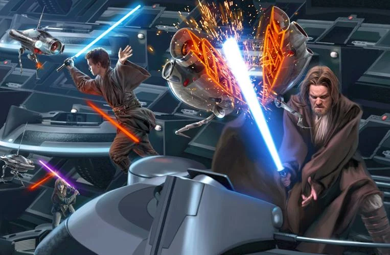 Оби-Ван Кеноби, Энакин Скайуокер и Сири Тачи защищают сенаторов от дроидов-убийц