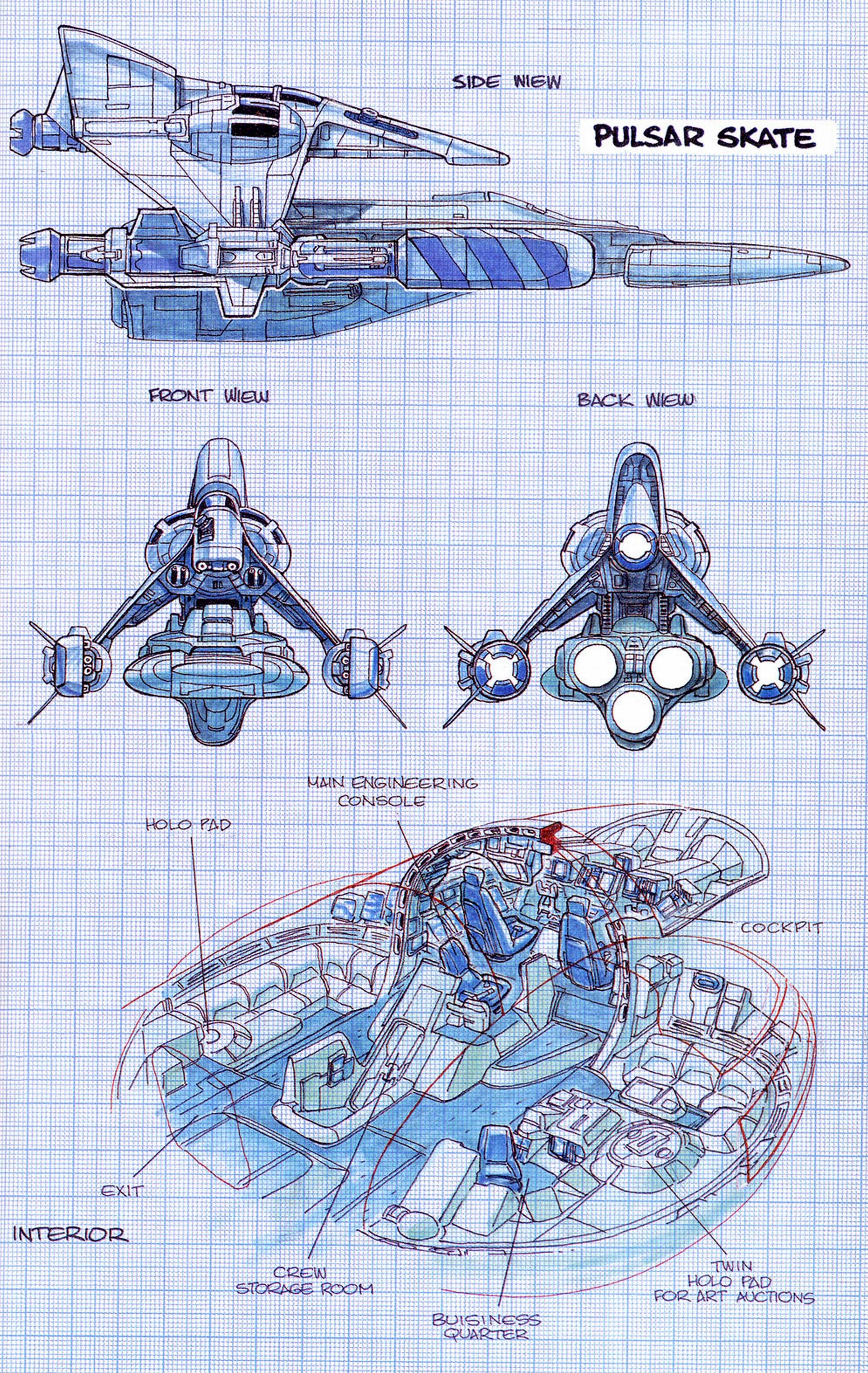 Бустер Террик приобрёл «Скат-пульсар» примерно в 19 ДБЯ. Он часто заезжал к на космическую станцию «Гас-Трета» в Кореллианском секторе, где его друзья Джаггед и Зена Антиллесы управляли заправочной платформой. В 6 ДБЯ их пятнадцатилетний сын Ведж помогал заменить фузионную камеру двигателя на «Скат-пульсаре».