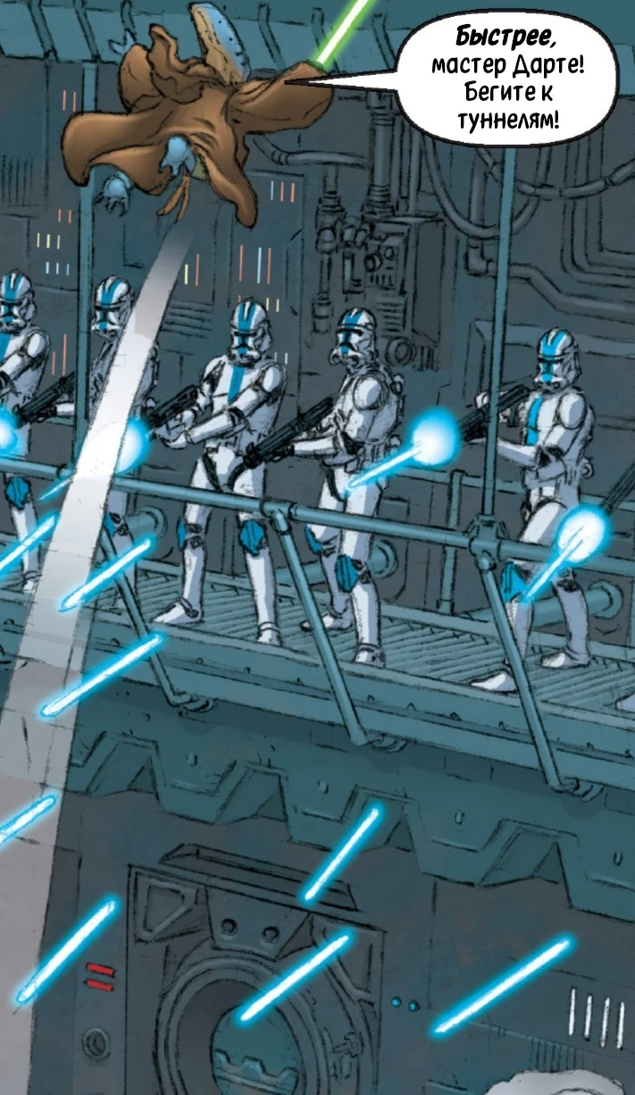 - «Прислушайтесь к своим ощущениям, мастер Цуй Чой. Туннели затрудняют восприятие, но разве вы не чувствуете, что он уже идёт? Ходячая смерть. Бронированный кулак Палпатина, преемник Дуку, наследник Мола. Новый ситх — Дарт Вейдер».