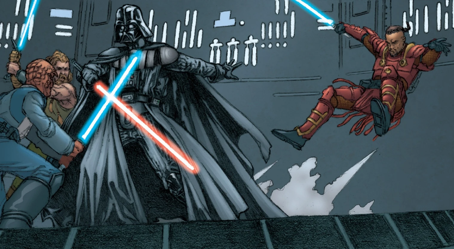 Затем Вейдер вступил в бой с джедаями Ма'кис'шааласом и Роблио Дарте, в то время как Арана попытался нанести по ситху удар сзади. Вейдер отбросил Арану в сторону Толчком Силы, а затем разрубил световым мечом грудь Ма'киса. Тем не менее, убивая джедая, Вейдер открылся для удара, чем воспользовался Джастус Фарр, ранивший ситха в спину своим двухклинковым световым мечом.