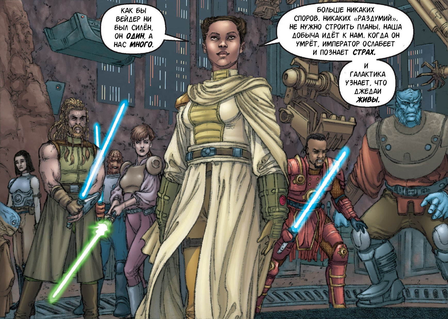 - «Больше никаких споров. Никаких "раздумий". Не нужно строить планы. Наша добыча идет к нам. Когда он умрёт, Император ослабеет и познает страх. И Галактика узнает, что джедаи ещё живы».