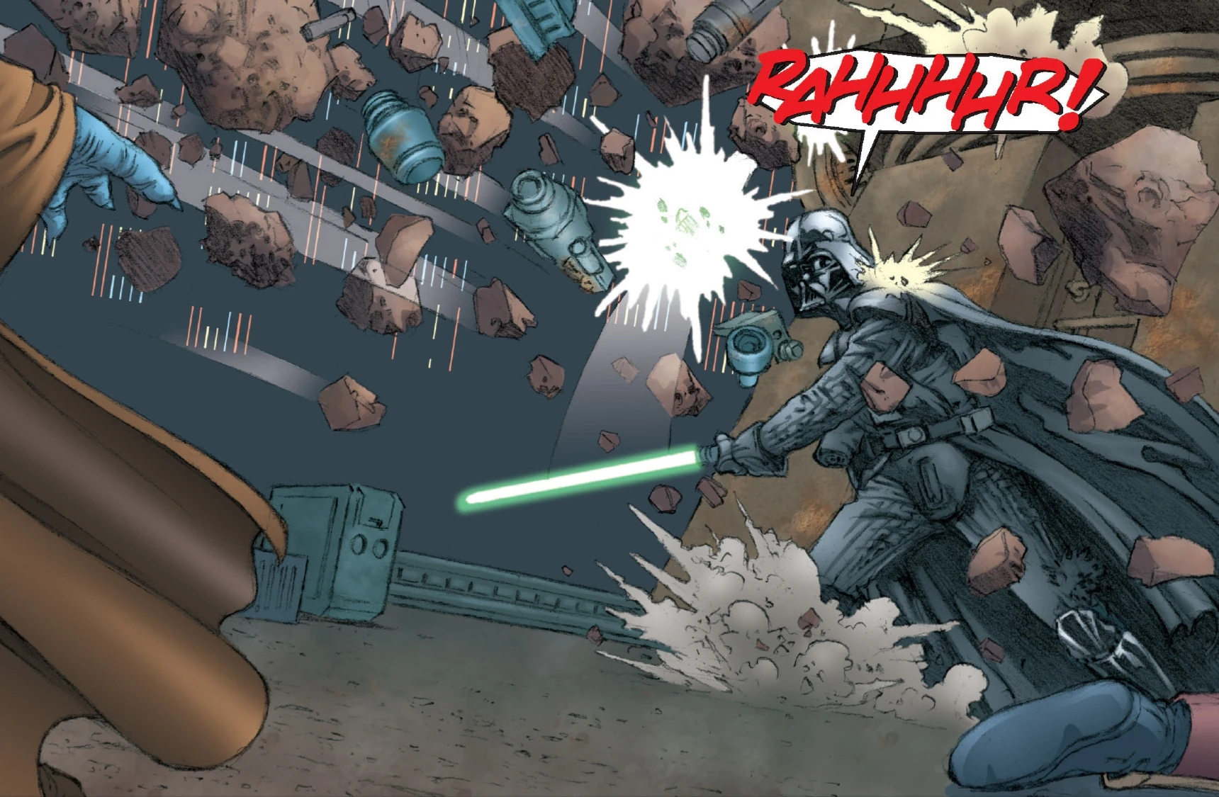 Взяв световой меч Суон, Вейдер обратился к трём оставшимся джедаям, вновь пообещав сохранить жизнь тому, кто расскажет ему о местонахождении Оби-Вана Кеноби. Те не стали нападать на ситха и вместо этого начали с помощью Силы метать в него обломки. Данная тактика оказалась весьма эффективной, и вскоре Вейдер вновь был повержен. Цуй Чой предложил ситху сдаться, но вышедший из себя ситх закричал, что уничтожит их всех.