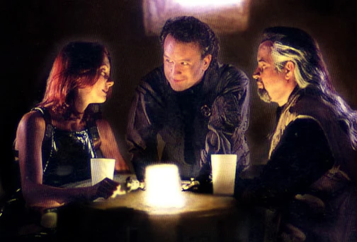 Корран Хорн (в центре, его изображает Майкл Стэкпол) с Марой Джейд (её изображает Шэннон МакРэндл) и Тэлоном Каррде (его изображает Тимоти Зан)