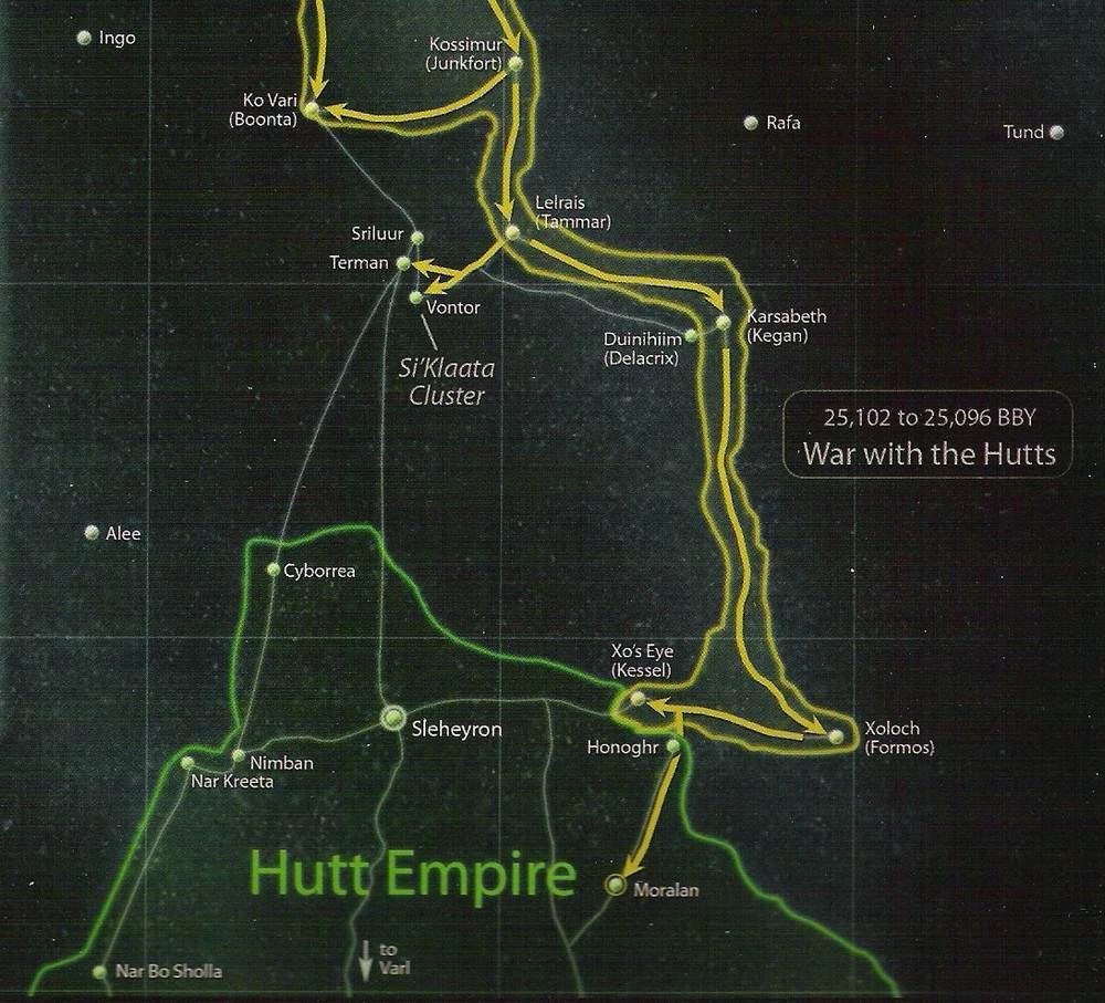 Однако ко времени покорения им Пределов Киирия до Зима начали доходить слухи о могущественной Империи хаттов прямо за их пределами, что она была невероятно богата и столь же велика, как владения Зима. Заинтересовавшись хаттами, Зим понимал, что они слишком сильны, чтобы открыто воевать с ними. Вместо этого он надеялся сосуществовать с хаттами, одновременно готовясь к войне с ними. Пределы Киирия были укреплены, а сеть гиперпространственных маяков была расширена, чтобы создать гиперпространственный маршрут, известный, как Маршрут воинов, к границам Пространства хаттов. Из допросов торговцев, проведенных Генохараданом, тионцы получили общее представление о территориях хаттов: на окраинах Пространства хаттов находился умеренный мир Ко-Вари, от которого торговые пути вели в скопление Си'Клаата, за которым находился Слехейрон, мир сокровищ, обозначавший границу основной сферы влияния хаттов, куда допускались только самые доверенные их рабы[1][3][4].