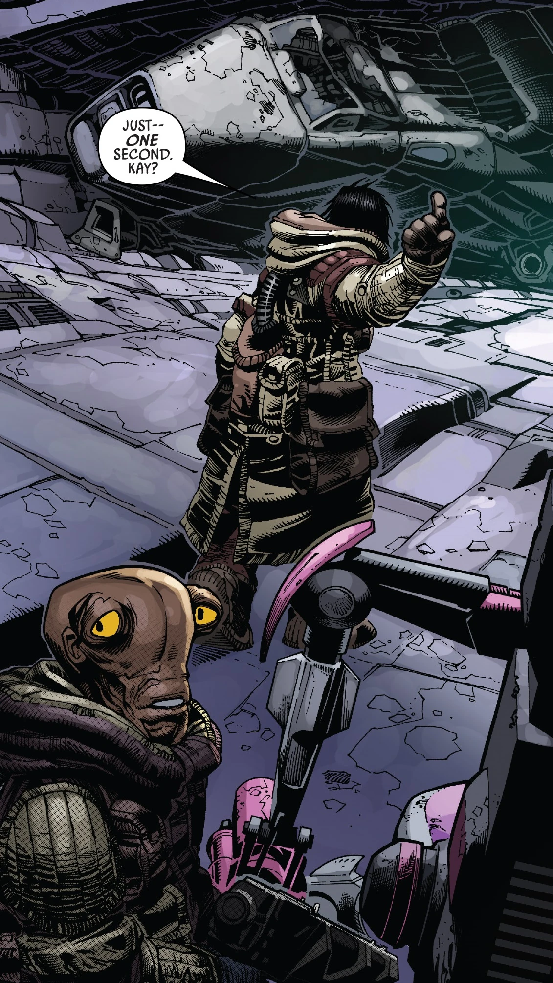 Афра и остальные обнаружили, что заключённые бунтуют. Один из них увидел Афру и, зная, что она была на допросе, обвинил её в запланированном разрушении тюрьмы. Группа начала убегать от бунтовщиков, и когда они обернулись, то сразу же столкнулись с большим инопланетянином с тяжёлым ружьём. На пришельца внезапно напал призрак Силы, который начал бесчинствовать над заключёнными. Толван спросила Афру, не сможет ли она посадить их на тюремный буксир и найти способ сбежать. Афра начала вглядываться в него, и Старрос подумала, что орудие большого инопланетянина может пробить корпус крейсера. Все четверо подняли ружьё и выстрелили в борт корабля, пробив в нём дыру[62].