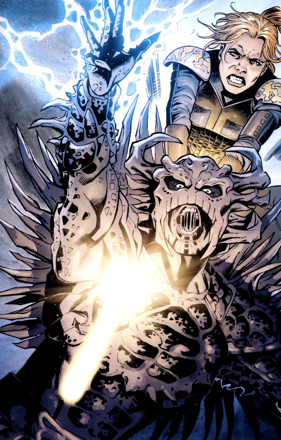 Пока Морн сдерживала лорда ситхов, Рей усмотрела удобный случай атаковать и поставила перед Кедом задачу отвлечь на себя ракгулов до тех пор, пока она не подберётся к Крайту сзади. Крайт тем временем применил Молнию Силы, но Рей в этот момент пронзила ему правое лёгкое колющим ударом. Морн отразила Молнию Крайта, многократно усилив её, и Эзлин попала под удар вместе с Крайтом. Пока обожжённая электричеством Эзлин лежала на земле на грани смерти, Морн Силой сбросила Крайта со скалы, чтобы добить его окончательно. После поражения сил ситхов Скайуокер освободил Морн от влияния Карнесса Муура, убив её, и упокоил дух самого Карнесса, уничтожив Талисман. Син и Вао заметили, что Рей жива, и Скайуокер попытался исцелить её при помощи Силы. Обнаружив, однако, что её тело слишком сильно повреждено, он пытался вливать в неё энергию Силы, пока ударная команда грузилась на борт «Майнока». Скайуокер отказал в проезде Кригу и Драко, так как знал, что Драко пытался доставить на Бастион Талисман Муура[15]. Вместо этого он предпринял отчаянный перелёт к планете Киффекс, где от преследований Империи ситхов скрывались Роук и его семья[16].