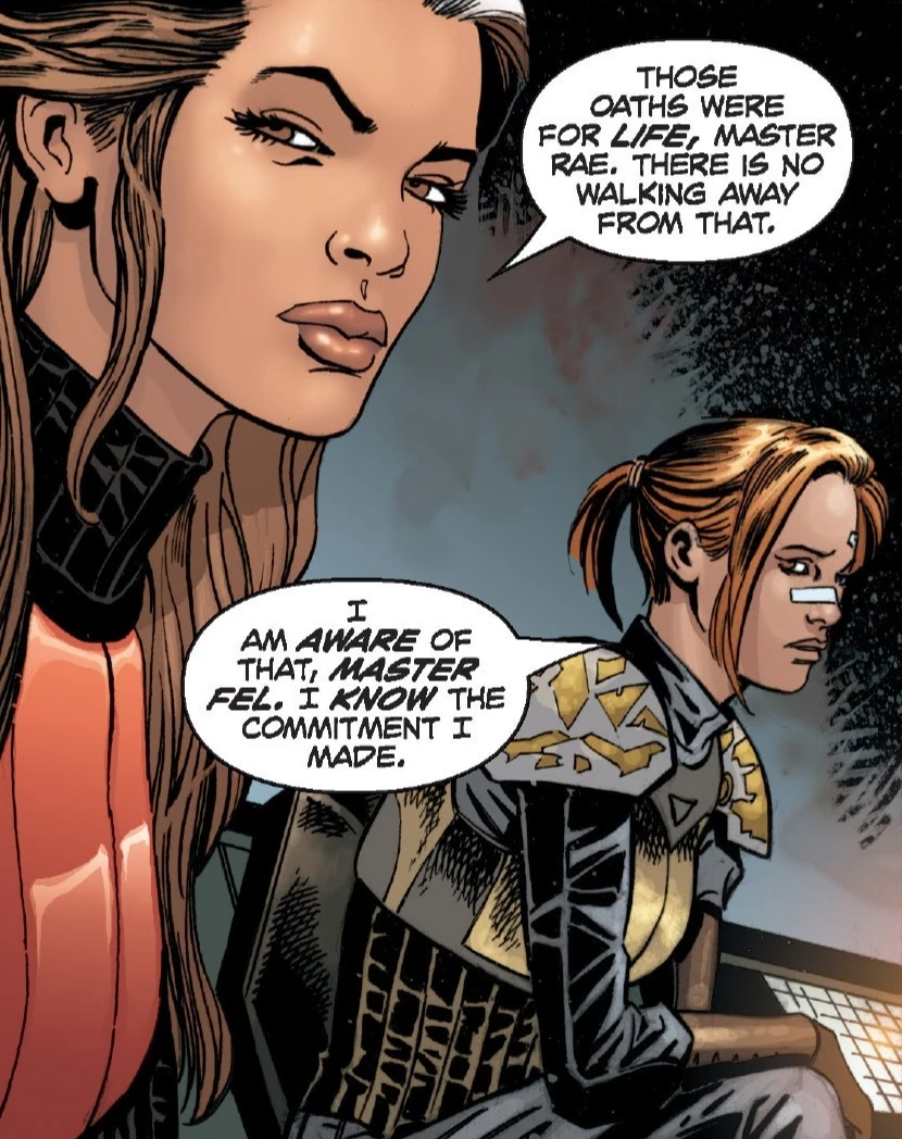 - «Когда ситхи напали... перебили столько джедаев на Корусанте и на Оссусе... из нас, учеников, многие просто разбежались. Мы делали всё, чтобы выжить. Как и ты! Тебя спас пират, и ты сам стал таким же. А меня спасли Имперские рыцари. Они завершили моё обучение, и я у них в долгу...»