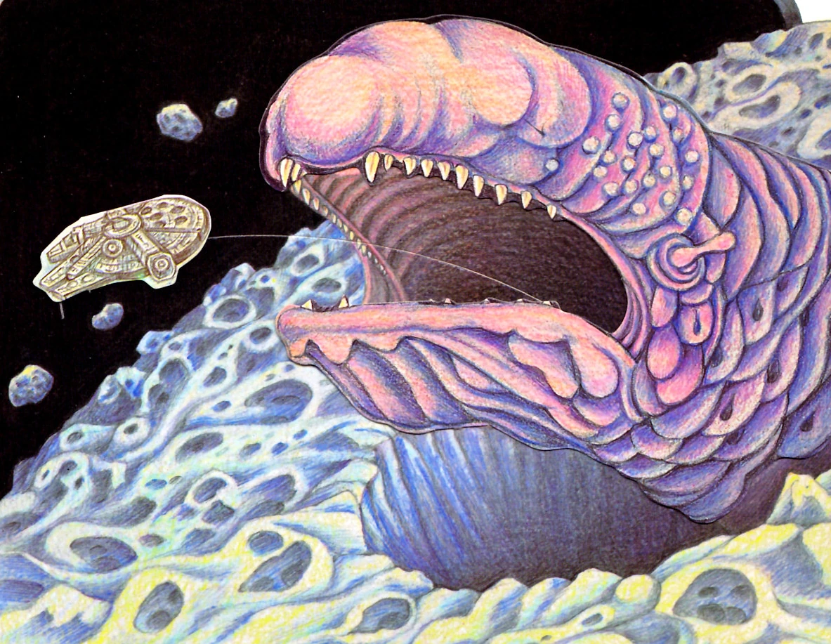 Ведущий специалист по созданию моделей в Industrial Light & Magic Лорни Петерсон создал метровую модель гигантской челюсти существа, усыпанной 12-сантиметровыми зубами цвета слоновой кости из полиуретана. Она использовалась для съёмок сцены с пролётом «Тысячелетнего сокола» по туннелю сквозь астероид. Позже зубы с этой модели раздарили знаменитостям либо распродали в магазине моделей[21]. Внутренности космического слизня были созданы через укладку на пол декораций ангара базы Эхо чёрной пластиковой плёнки и завешивание чёрными занавесками пространства вокруг «Сокола», а туман был создан при помощи сухого льда. Главный специалист по визуальным эффектам Джон Нолл называл эти декорации «безусловно самыми дешёвыми декорациями созданными» для фильма.[22] Для создания звука и ощущения слизи, когда персонажи фильма шли по внутренностям существа, шумовики Скотт Геккер и Роберт Рутледж использовали почти одиннадцать килограмм чистого говяжьего жира в больших кусках, а также десятки сырых яиц, по которым они затем прошли в различной обуви, чтобы создать звуки шагов персонажей.[23]