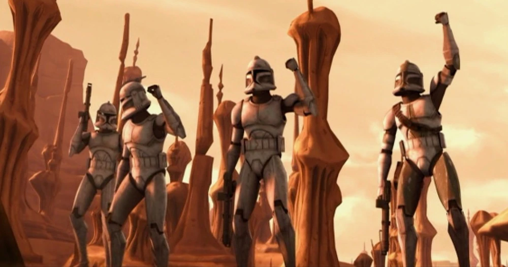 Коммандер Гри и его солдаты празднуют уничтожение сепаратистского супер-танка на Джеонозисе