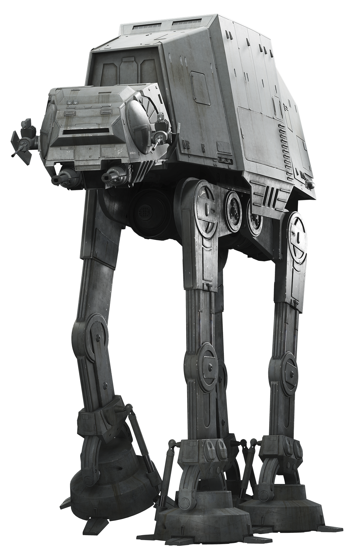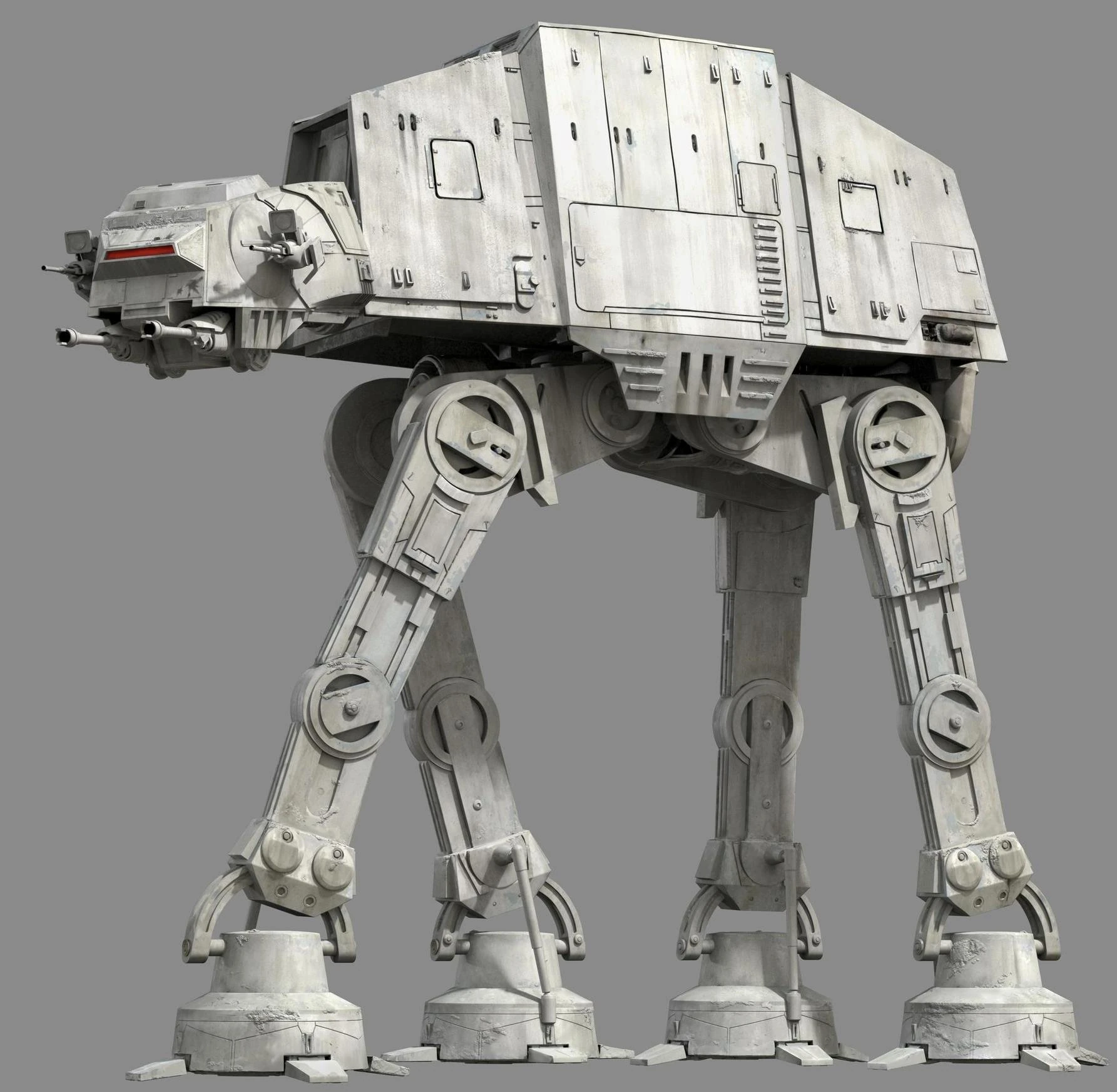 Тяжёлая тихоходная бронемашина внушительного вида на четырёх шагающих опорах, приводимых в движение сложной системой шарниров и планетарных передач. Шагоход имел большое тактическое преимущество на подходящем ландшафте благодаря своей высоте (22,5 метра) и крупнокалиберному бортовому оружию в передней части кабины, позволявшему стрелять прямой наводкой с дистанции, на которой ответный огонь вражеской артиллерии не причинял единице существенного вреда.[3] Большой вес и габариты создавали трудности доставки на позиции, потому каждая единица перевозилась в пристыкованном состоянии под днищем крейсеров «Гозанти»[8] Помимо самоходной артиллерии АТ-АТ служил боевой машиной пехоты,[7] способной перевозить до сорока солдат,[источник?] не считая экипажа и вспомогательных средств, таких как гравициклы.[5]