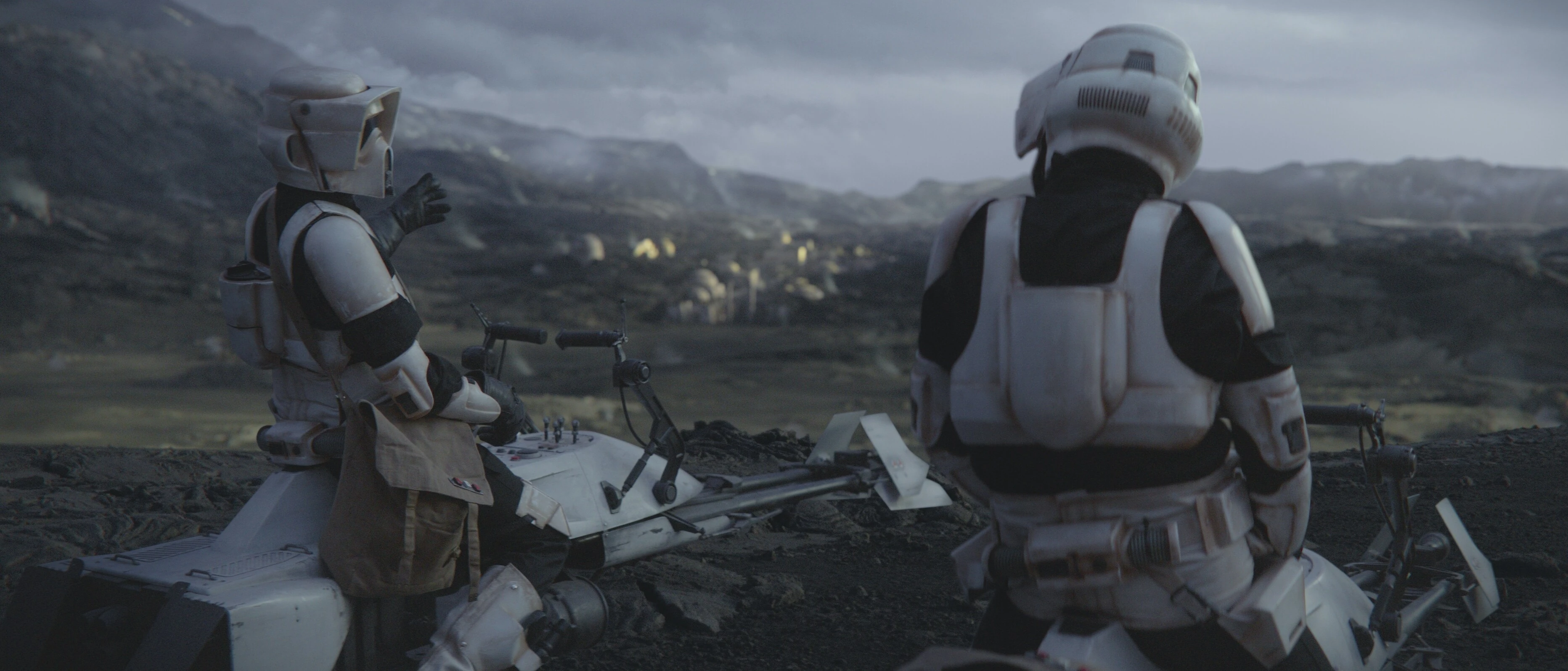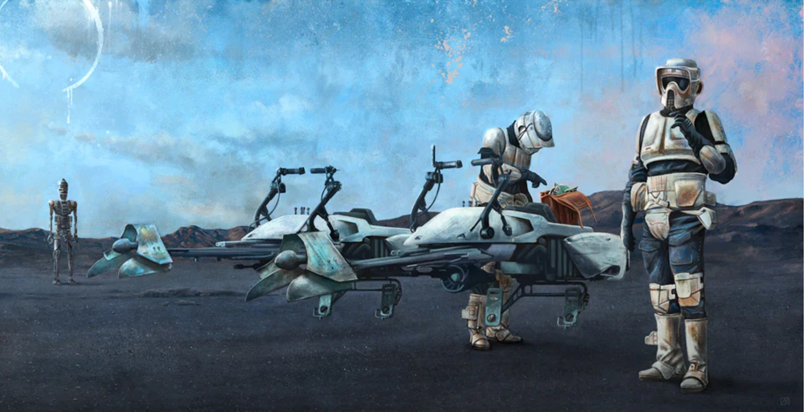 Затем AP-1982 вытащил свой бластер и от скуки начал стрелять по ближайшему объекту, но не смог попасть ни разу. Присоединившийся к нему JS-1975 также не смог попасть по объекту. Затем AP-1982 предложил дать ребёнку воды, однако JS-1975 вновь отказался, предположив, что тот просто хочет посмотреть на Грогу. AP-1982 начал возмущаться, заявив, что тот видел ребёнка, когда запихивал в сумку, на что JS-1975 ответил, что разглядел младенца лишь мельком, пока брал его на руки. Он также заявил, что не станет вынимать Грогу, пока не передаст его Гидеону[4].