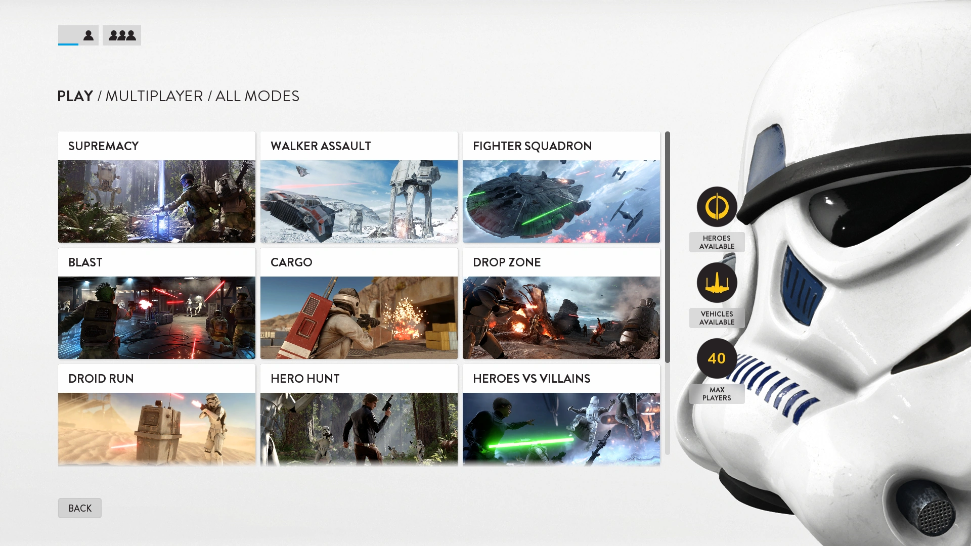 В трёх режимах: «Атака шагоходов», «Превосходство» и «Переломный момент» имеется возможность участия до 40 игроков в матче. В других режимах допускается меньшее количество игроков.[10] Другие многопользовательские режимы: «Эскадра», «Разгром», «Зона выброски», «Битва за груз» и «Захват дроидов».[18]