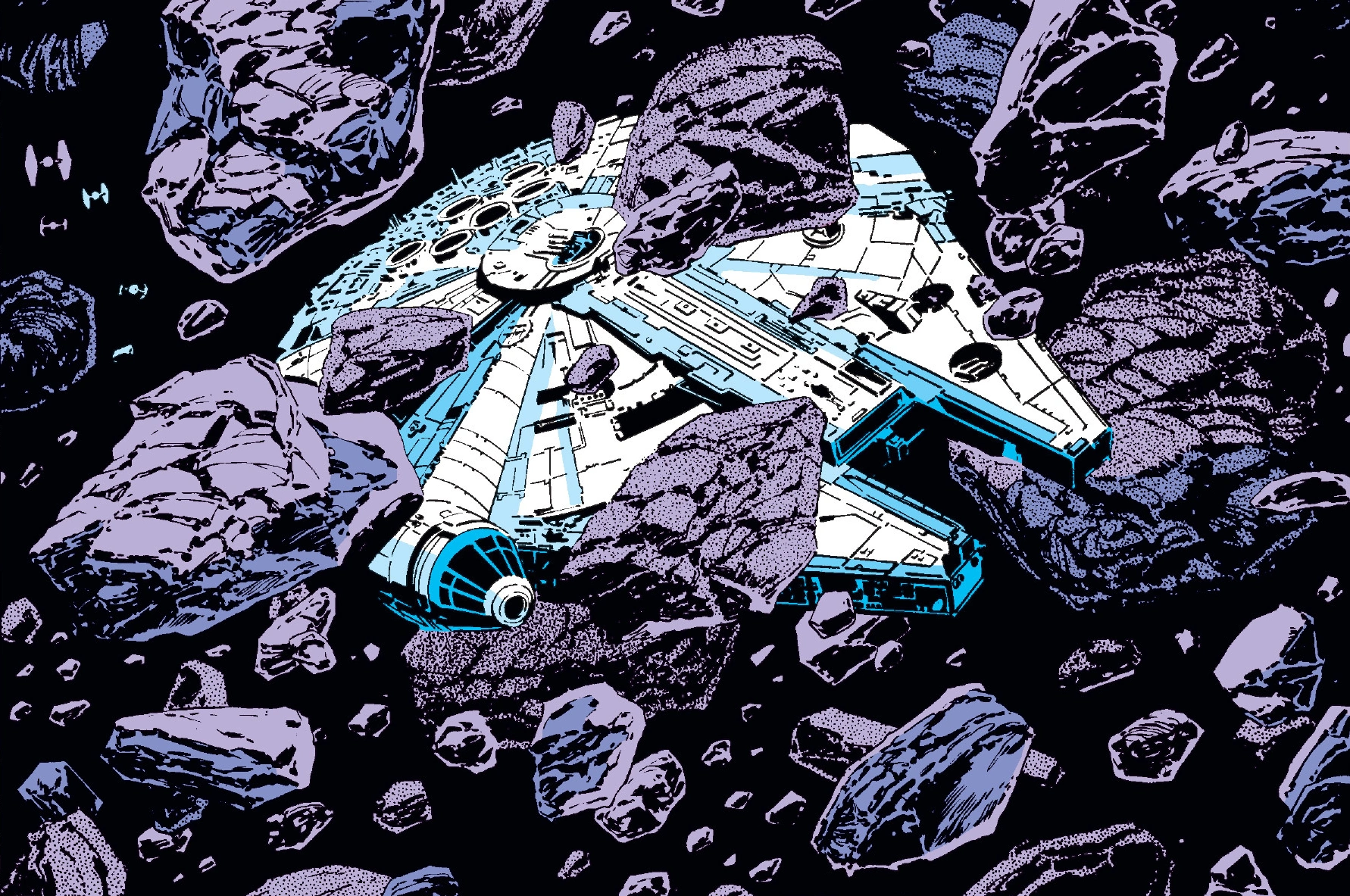 Millennium Falcon bir asteroit tarlasında TIE savaşçılar tarafından kovalanıyor.