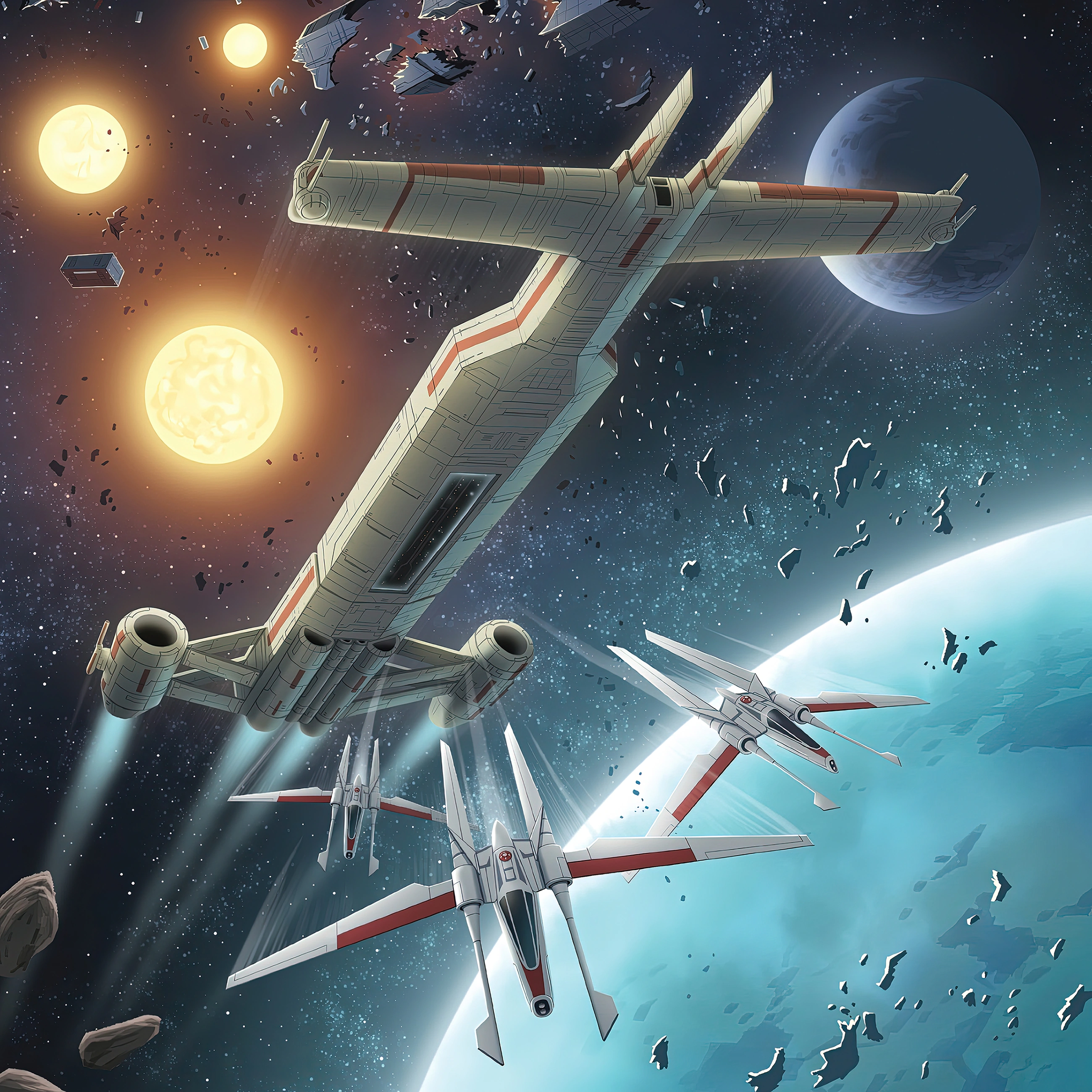 Cumhuriyet Donanması; Acclamator-sınıfı transgalaktik askeri taarruz gemileri ve diğer tip destek gemileri de bulunduruyordu ancak ana omurgası Venator-sınıfı yıldız destroyerleriydi.[88] Hem kargo hem de asker nakletmek için uygun olan Venatorlar gemiden gemiye savaş için geliştirilmişti. Venatorların ayrıca Cumhuriyet yıldız savaşçılarını barındırmasını sağlayan geniş hangarları vardı.[89]
