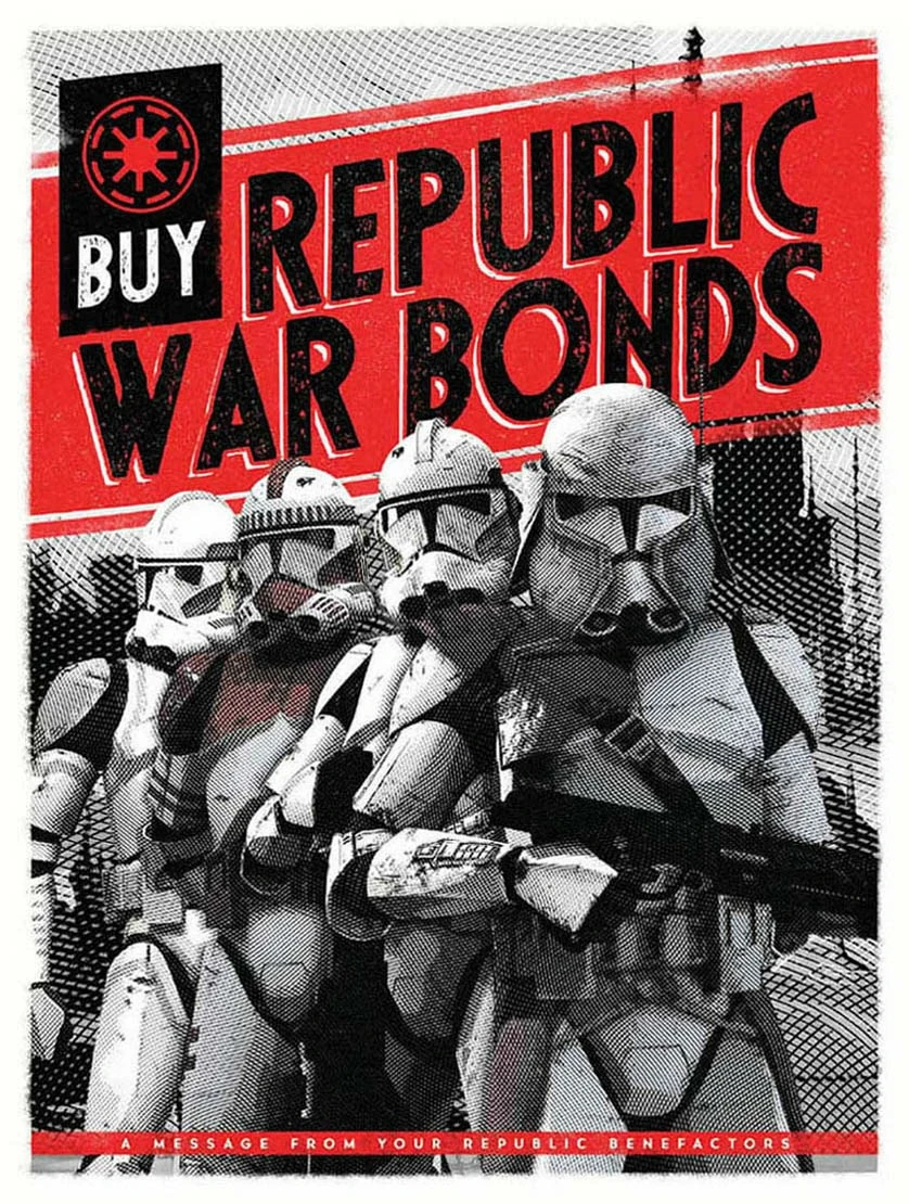 Klon Savaşları, Büyük Cumhuriyet Ordusu için yapılan harcamalar dolayısıyla galaktik ekonomiyi altüst etti ve Cumhuriyet'i iflasın eşiğine sürükledi.[97] Hükûmet durumu çözmek adına halk arasında savaş için Cumhuriyet'e destek olmanın herkesin yapması gereken bir vatandaşlık görevi olduğu fikrini yayan propaganda faaliyetleri yürütüp vatandaşlarına savunma tahvilleri sattı. Ek olarak Cumhuriyet, Coruscant gibi kozmopolit gezegenlere daha önce görülmemiş bir şekilde sivil hava aracı vergisi koyarak kasasını doldurmaya çalıştı.[13]