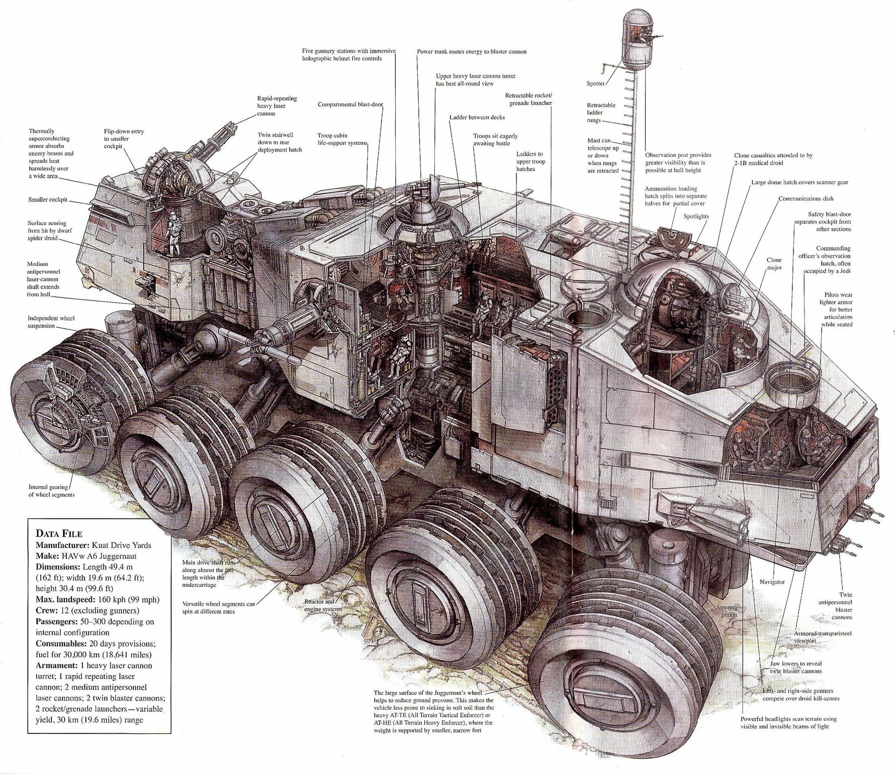 «Джаггернаути» виконували роль не тільки фронтової штурмової машини, а й потужного піхотного транспорту.[1] Також, окремі турботанки могли застосовуватися як неприступні мобільні командні центри.[4] Вони були розроблені для придушування за допомогою своєї величезної вогневої потужності захищених щитами військових споруд, деякі з яких могли витримати обстріл одного турботанка протягом годин. Цілі, які не були захищені щитами, HAVw A6 могли уразити такою вогневою силою, що на уражених нею відрізках місцевості утворювалася вогнена куля, жар від якої був рівний жару від вибуху ядерної бомби.[1] Попри те, що HAVw A6 мали схильність часто ламатися,[4] вони були найбільшими серед важких штурмових машин серії «Джаггернаут»,[3] через що солдати називали їх «плитами на колесах»,[2] а одна лише згадка про них викликала спогади про квінтильйони знищених бойових дроїдів. Ці міцні та потужні машини були відповідною опорою для армій клонів.[1]