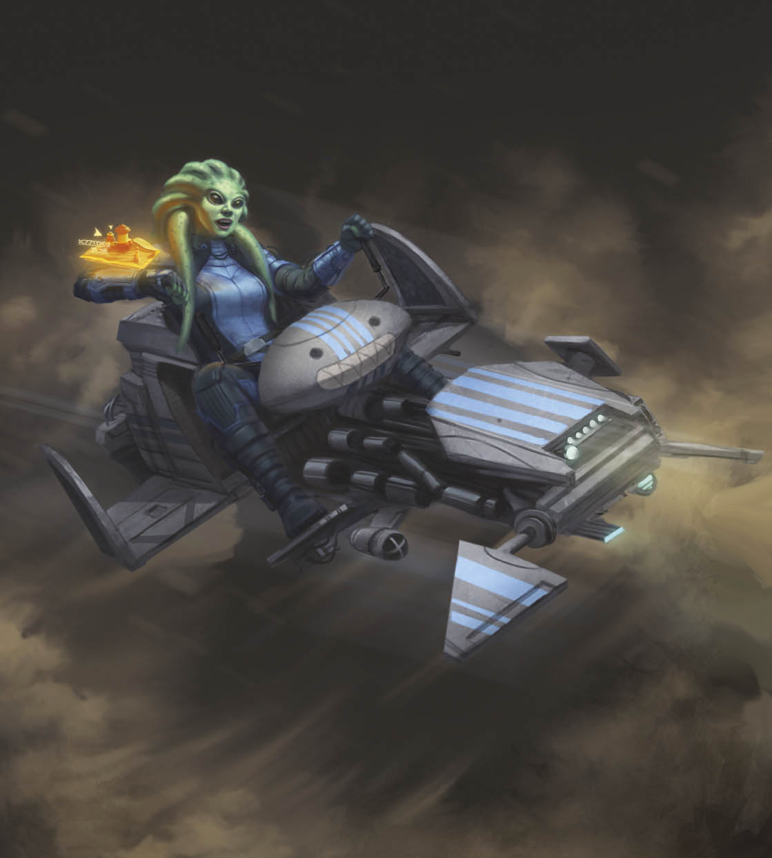 Aratech's 614-AvA was a small, fast, lightweight speeder bike used by the Imperial Military. Designed initially as a portable, modular scout vehicle typically packed into a larger vehicle like a walker or a landspeeder, the 614-AvA was more akin to a swoop than to a full-fledged speeder bike. It consisted of little more than a combination repulsor drive-thruster pack, a control pod, and a set of variable-geometry control surfaces mounted to a pair of stout frame rails. The rails were telescopic, allowing the speeder bike to collapse to roughly a third of its full size with no need for tools. With the push of a button, the 614-AvA collapsed into a cube about a meter square; this feature allowed the 614-AvA to be easily shipped in bulk.[3][2]