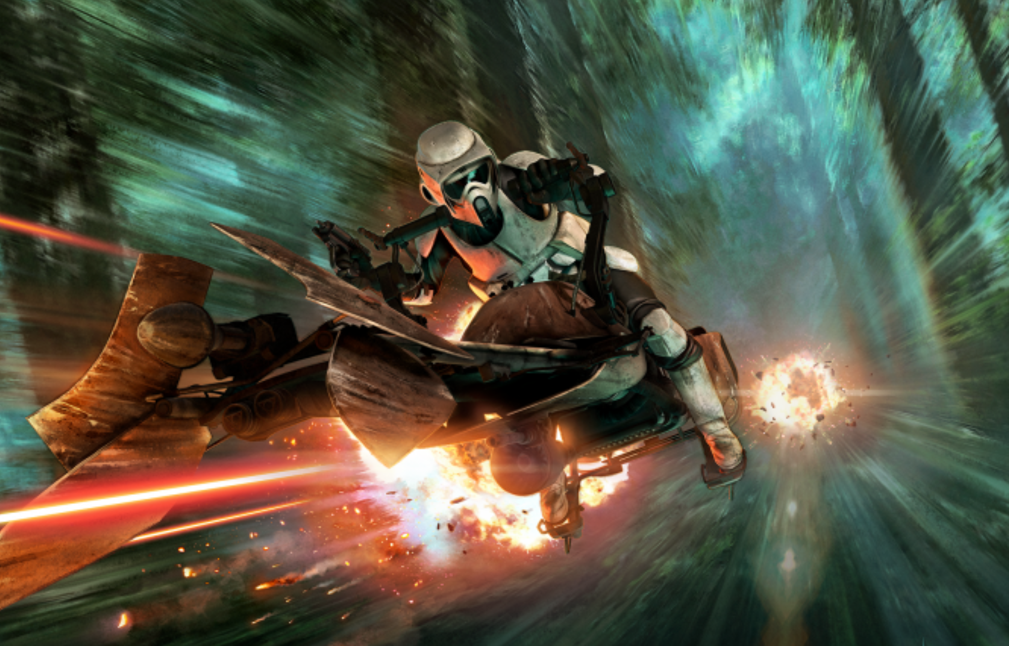 A scout trooper, a typical pilot for the 74-Z, pilots one of the speeder bikes.