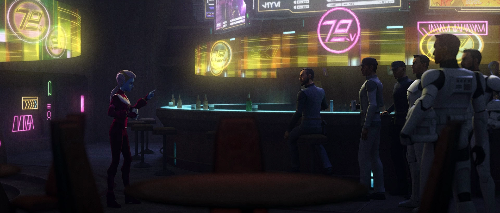 79's was a cantina located in the galactic capital of Coruscant. During the Clone Wars, the clone troopers of the Grand Army of the Republic would gather at 79's to party and blow off steam when off duty. 79's was known on Coruscant to be a clone bar; however, non-clones would also frequent it. ARC trooper Fives had taxi pilot Jay Igno take him to 79's where he met his friend Kix to ask for help after Fives discovered the Order 66 conspiracy. Fives fled the bar when the Coruscant Guard shock troopers arrived to search for him.[1]