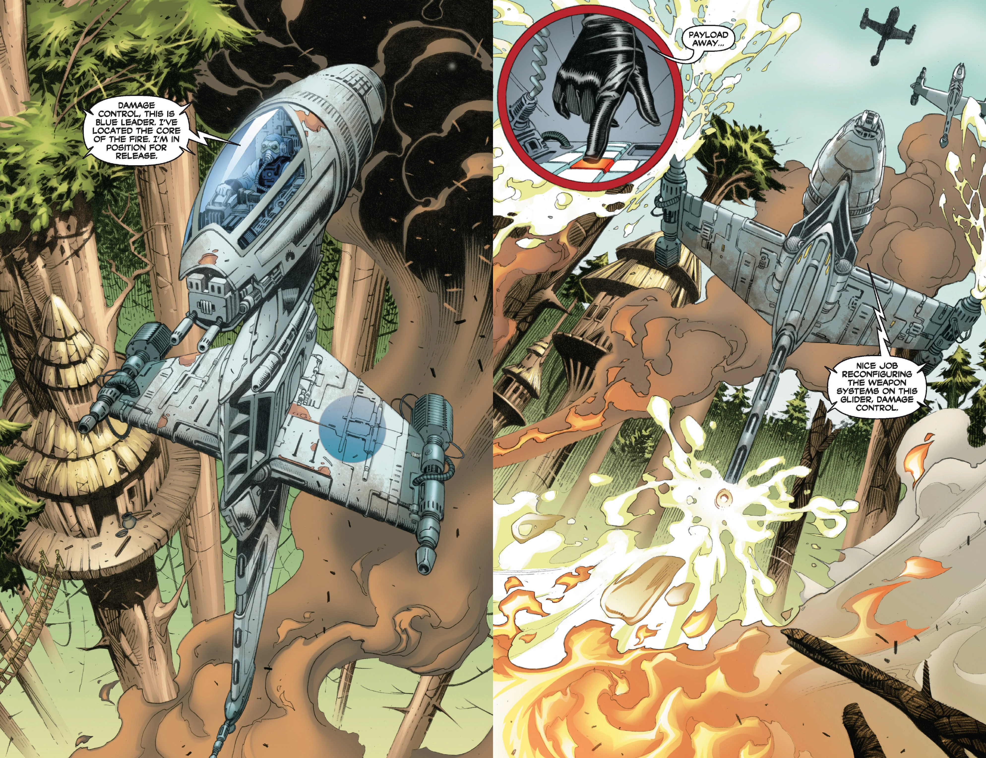 Despite its limited numbers at the time, it was a key Rebel craft in the Battle of Endor, where a squad of these fighters took down two Imperial-class Star Destroyers.[11] After the battle, the B-wing's modular design allowed it to be retrofitted with sprayers for firefighting duty on Endor, to extinguish the fires caused by the falling debris.[26]