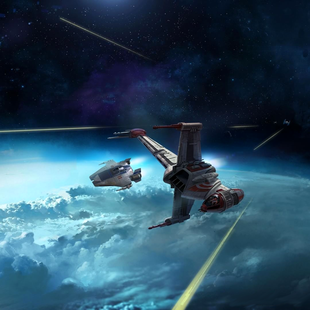 A B-wing and an A-wing being pursued by Imperial TIE fighters