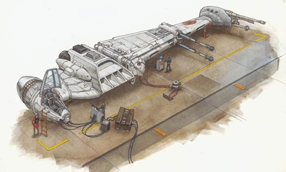The B-wing was a highly adaptable design, with modular hardpoints and other components. Its weapons could be reconfigured more easily than many other Alliance fighters. The B-wing also had a unique gyroscopic rotating cockpit module which was independently stabilized to allow the pilot to coordinate advanced flight and attack maneuvers. The fighter was powered by either of two engine systems: a Quadex Kyromaster engine with four thrust ports, or four Slayn & Korpil JZ-5 Fusial Thrust Engines.[10] The Quadex core was the same version carried on-board CEC YT-1300 light freighters. The rotating airfoil allowed the B-wing to be placed vertical in launch racks,[11] although it was also capable of landing horizontally.[18]