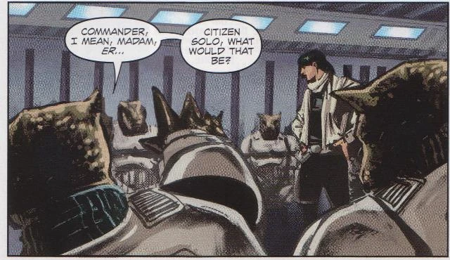 Solo took out enemy droids with the ship's laser cannons as one of Stazi's tankers, the Trand Cappa, released water into the Mon Calamari Orbital Shipyards. When two pirates opened one of the shipyards' bay doors, all of the freighter's crew save for AG-37 went aboard in order to prevent the Mon Calamari and Quarren refugees inside from being sucked into the vacuum of space. AG-37 continued to fly in the battle, which was swiftly won by the Triumvirate fleet. AG-37 then committed both himself and his freighter to a hunt for Darth Wredd that Solo, Assam, and the comm droid had been undertaking, and Sauk joined as well.[3]