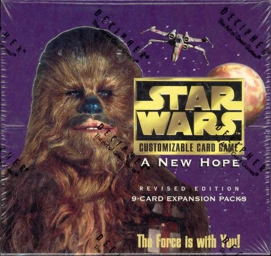 The A New Hope Revised Unlimited set is the first unlimited full expansion set of the Star Wars Customizable Card Game, a card game based on the Star Wars universe. It consists of 162 cards dividing into 81 Dark Side and 81 Light Side cards, and was introduced in July of 1996. This set consists of 54 rare, 54 uncommon, and 54 common cards. This set introduced many of the classic characters from Star Wars: Episode IV A New Hope that were not included in the original base set, Premiere Limited. Some of the notable cards include Chewbacca, R2-D2, Greedo, Wedge Antilles and the Death Star. This set also introduced the first epic event cards, such as "Commence Primary Ignition" and "Attack Run," to the game. A complete list of the A New Hope Revised Unlimited set may be found on an archived copy of Decipher's webpage.