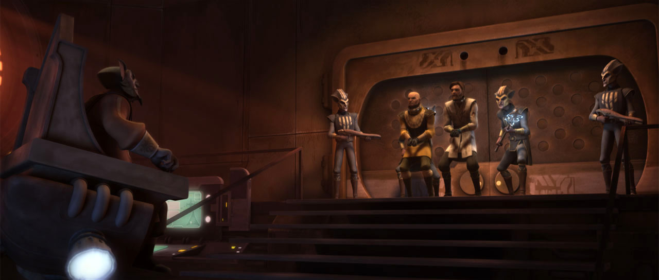 While Skywalker and Tano remained captive on Zygerria, Kenobi, Rex, and Kiros Governor Roshti were sent to the processing hub on Kadavo. Agruss was on hand to greet Kenobi when he and his fellow captives arrived on the planet,[4] as he was the first ever Jedi to be interred at his grueling facility.[1] While the Keeper expressed his excitement at having a Jedi at the processing facility, he immediately demonstrated his authority in an attempt to force Kenobi into submission—without warning, Agruss[4] had cruelly[7] several Togruta slaves dropped into the volcano above which the processing hub rested. He proclaimed that any attempt at disobedience on Kenobi's part would only result in the further suffering of others.[4] Even Kenobi's attempts at helping the Togruta slaves backfired, causing them to avoid the Jedi or risk further pain. To prevent any more needless deaths or suffering, Obi-Wan kept his head down,[3] laboring under Agruss' cruel glare in seeming obedience.[1]