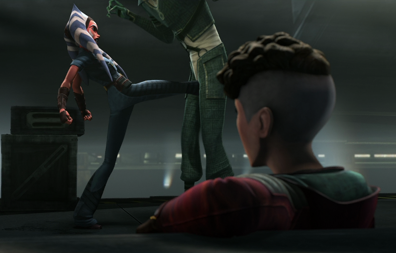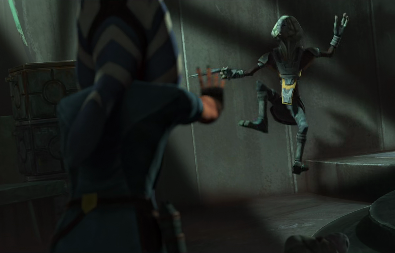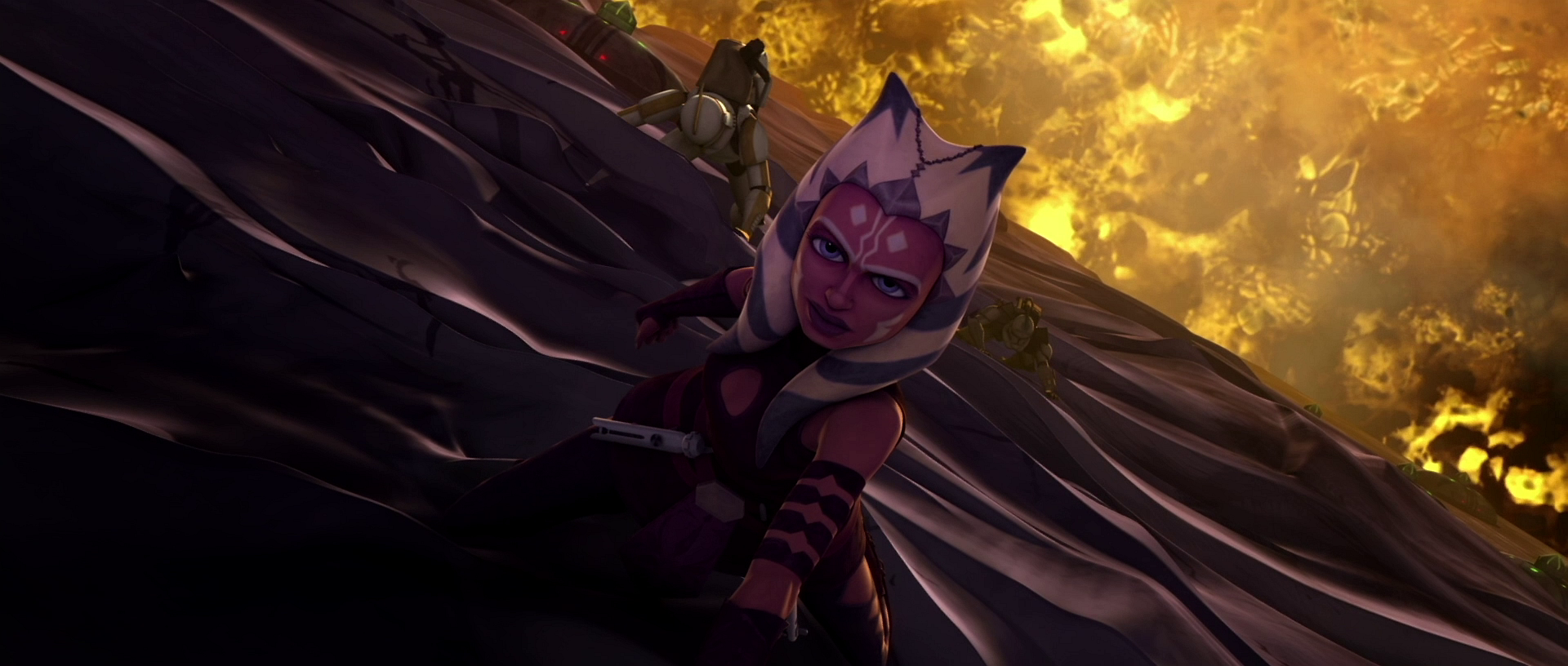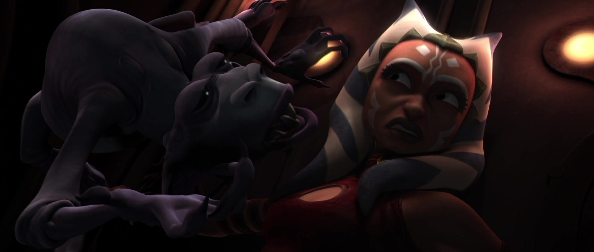 Ahsoka points out the approaching gundark after rescuing Skywalker and Kenobi.