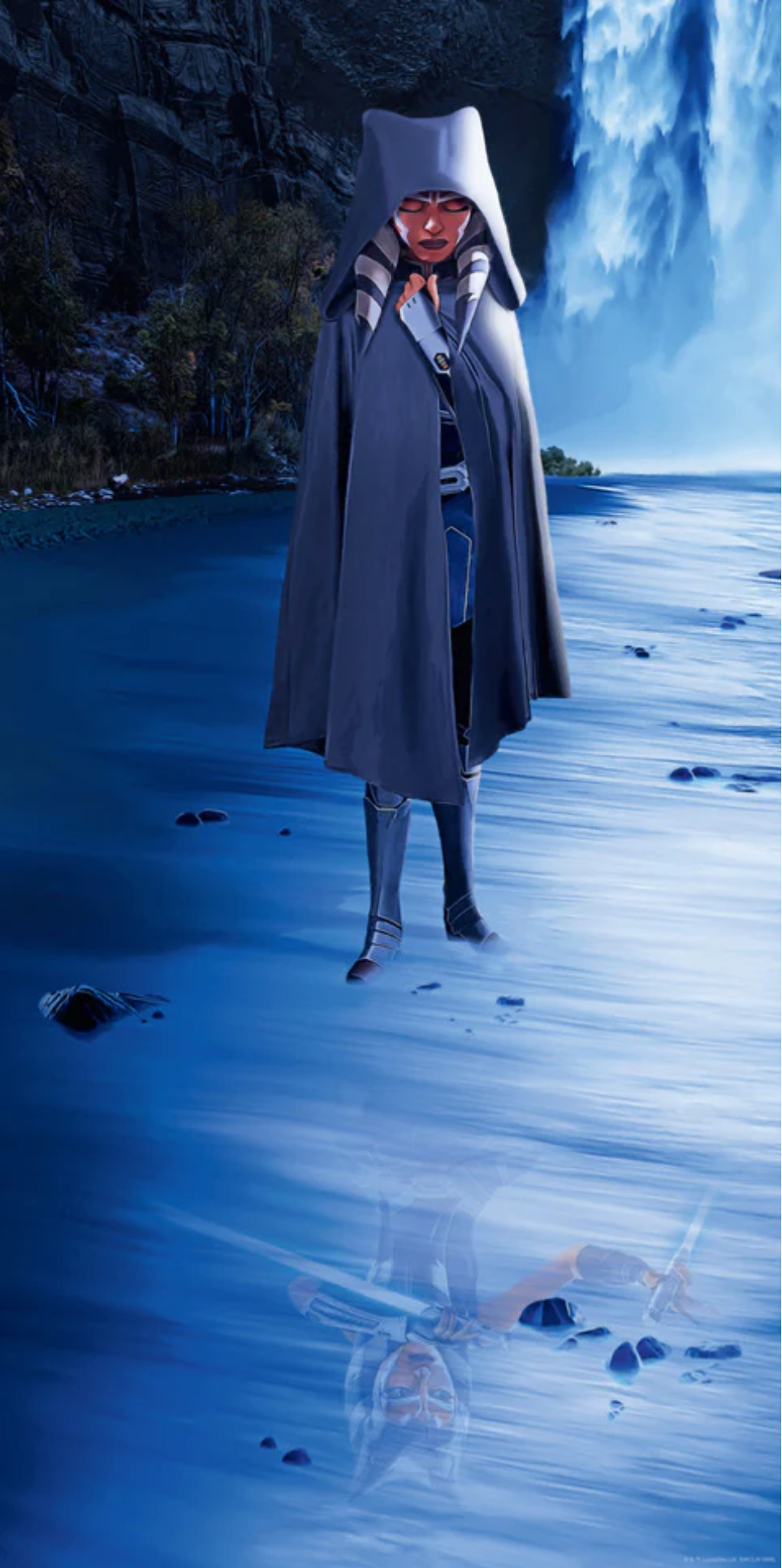 While operating on the planet Corvus during the New Republic Era, Tano wore sleeveless dark blue robes and a large belt from which she hung her lightsabers, as well as a pair of silver vambraces and arm wrappings on her forearms. Tano draped a dark cloak over these clothes during her assault on Calodan. This cloak hid her amid the smog of Corvus and also doubled as a poncho. Although Din Djarin incinerated this cloak upon meeting the Togruta, she replaced it not long after with a similar covering.[172]