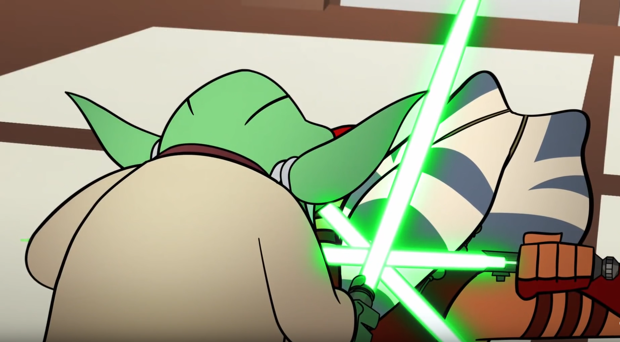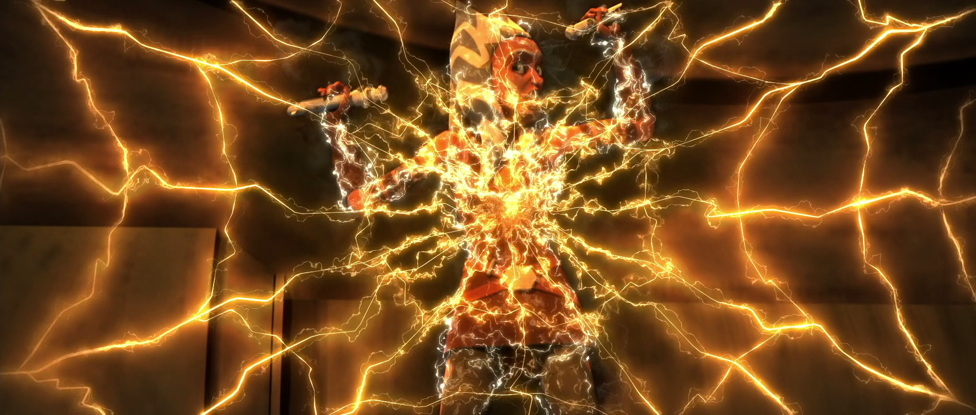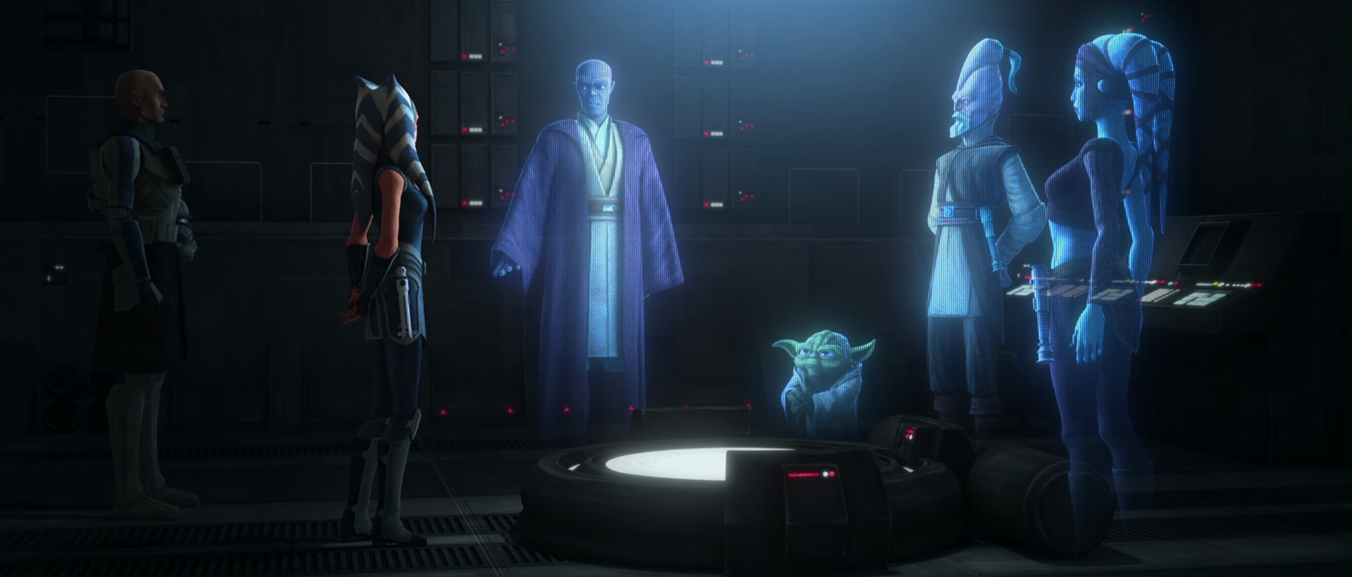 Thereafter, Obi-Wan Kenobi and Anakin Skywalker enlist her help to rescue Yoda from the Sith shrine underground. During this journey, Ahsoka and Anakin would have flown autogyro-style vehicles and encountered large beasts resembling Kaiju. At some point during the arc, Ahsoka would protect the Jedi Holocron Vault from Darth Sidious, who would shoot Force lightning at her through the vault's doors.[229]